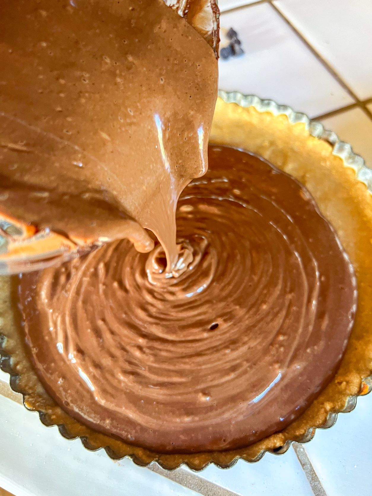- Transfer melted chocolate into the container of a blender. Add chocolate plant-based milk, almond butter, and silken tofu. Process until very smooth and creamy.