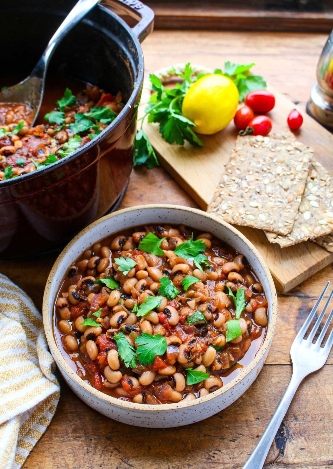 Black eyed peas are not only rich, earthy delicious pulses–they are considered lucky! And for good reason, as this plant food is packed with nutrition, affordable, and versatile. This simple, rustic recipe for Black Eyed Peas with Tomatoes and Onions (which is also vegan and gluten free) gives a nod to Southern regional foodways. My Arkansas-born mother loved to cook black eyed peas year round. She would simply soak them overnight, and then simmer them with just a touch of salt the next day. These beans were so yummy served over cornbread. This black eyed peas recipe is almost that simple–all it contains is a bag of dried black eyed peas, onion, garlic, smoked paprika, Cajun seasoning, black pepper, vegetable broth, canned tomatoes, lemon, and parsley. You can prepare it in only 10 minutes, then set the pot to simmer until the peas are tender. You can use this recipe for crock pot black eyed peas or instant pot black eyed peas, too. Just serve it with cornbread (like my mom used to) or whole grain bread and a side salad.