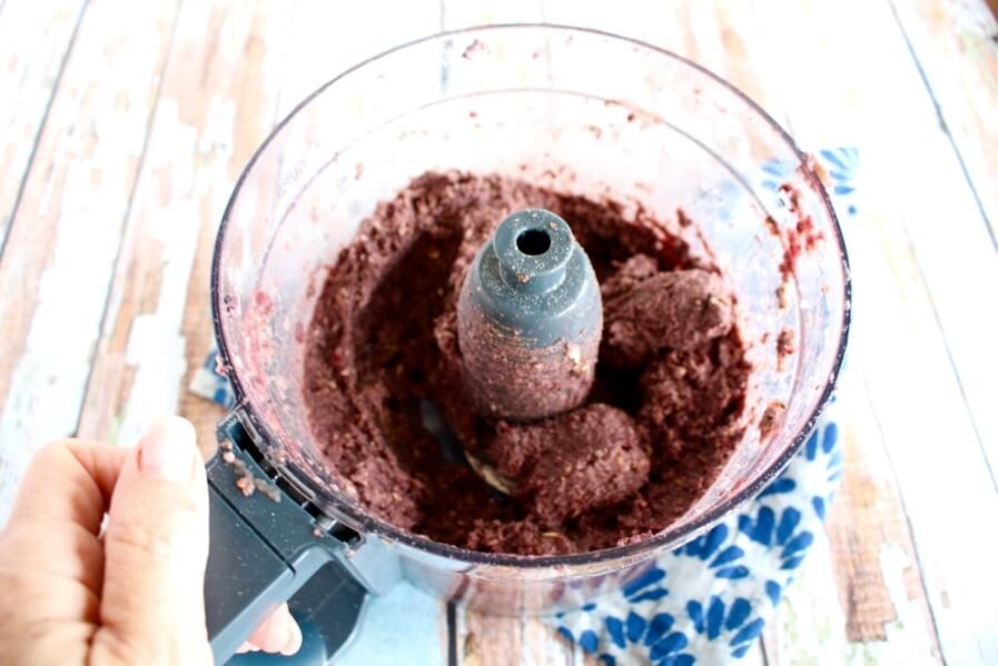 - Add applesauce, dates, cranberries, blueberries, peanut butter, and vanilla and process until smooth. This may take a few minutes, as you may need to pause, scrape down the sides, and process again until mixture is smooth.
