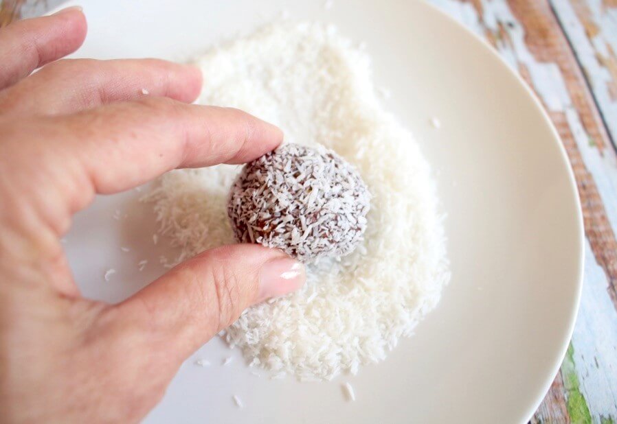 - Remove from refrigerator and form into small balls by hand. Place coconut on a dish and roll each ball into the coconut. Refrigerate until serving time.
