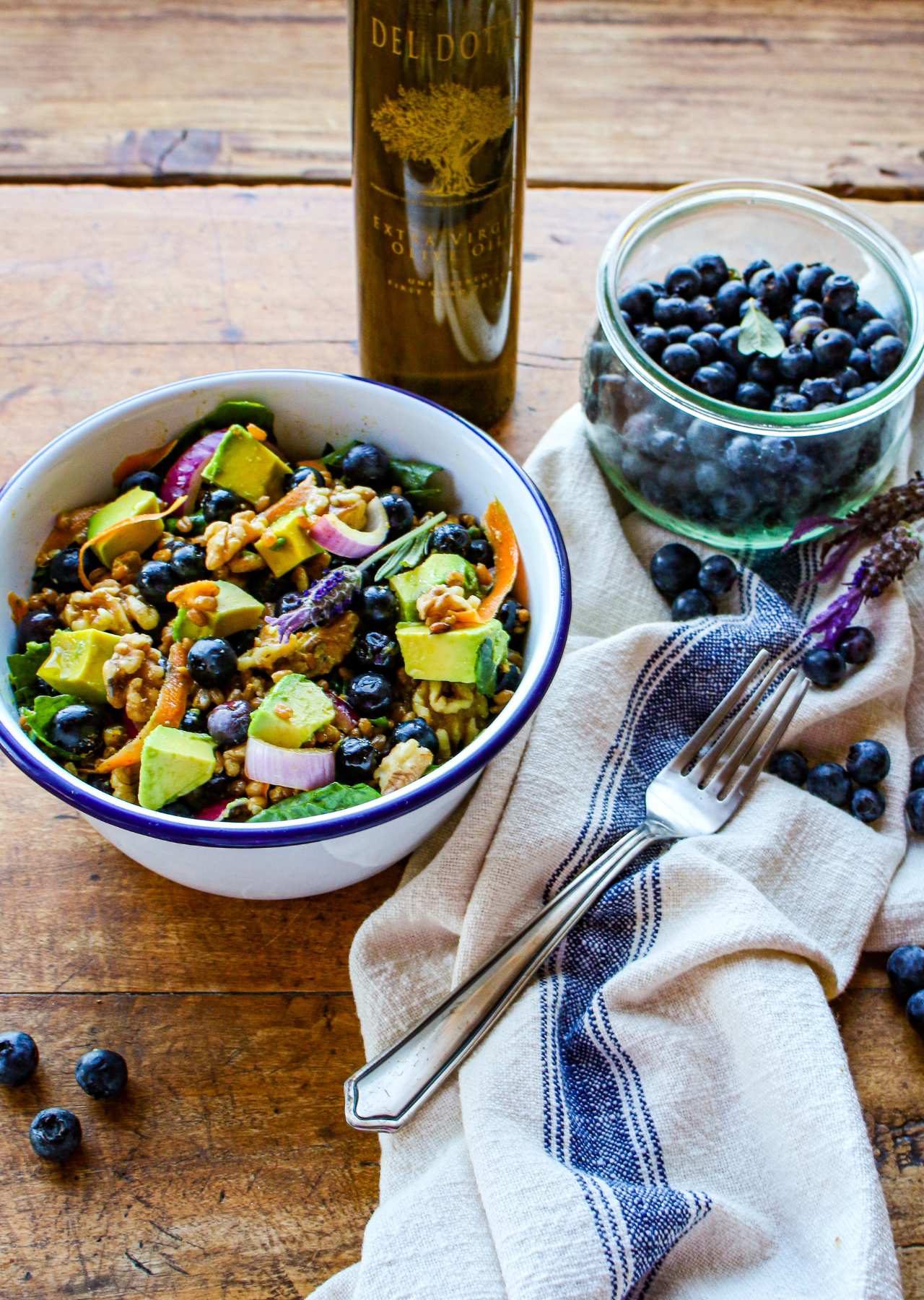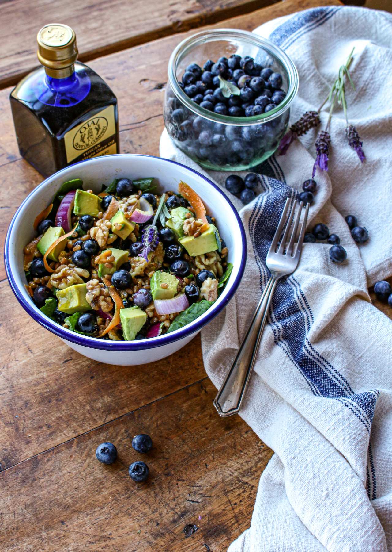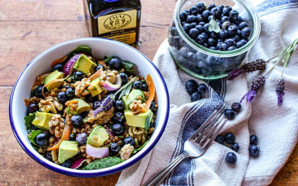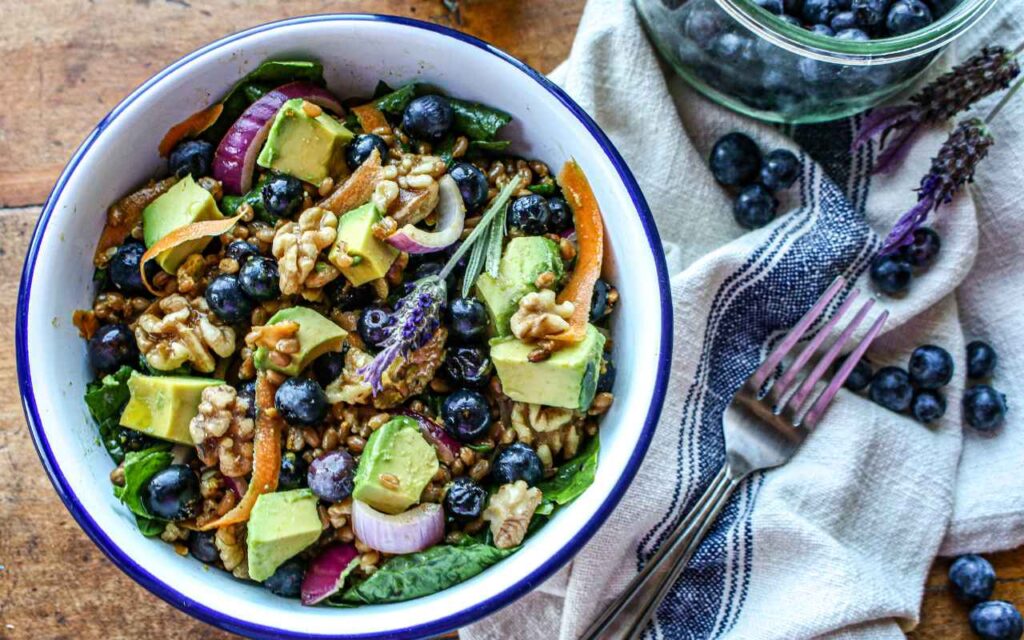 - Prepare salad by adding spinach leaves, blueberries, onion, avocado, walnuts, and cool wheatberries to a large salad bowl. Using a mandolin or vegetable peeler, shave carrots into thin strips. Add to the salad bowl.