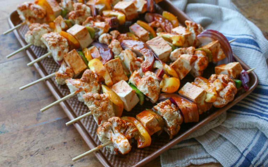 - Thread the skewers with the prepared vegetables and tofu, dividing ingredients among 8 skewers and alternating ingredients for variety. Place skewers on a baking sheet.