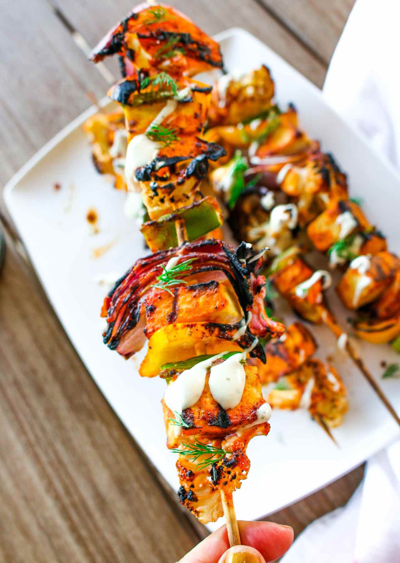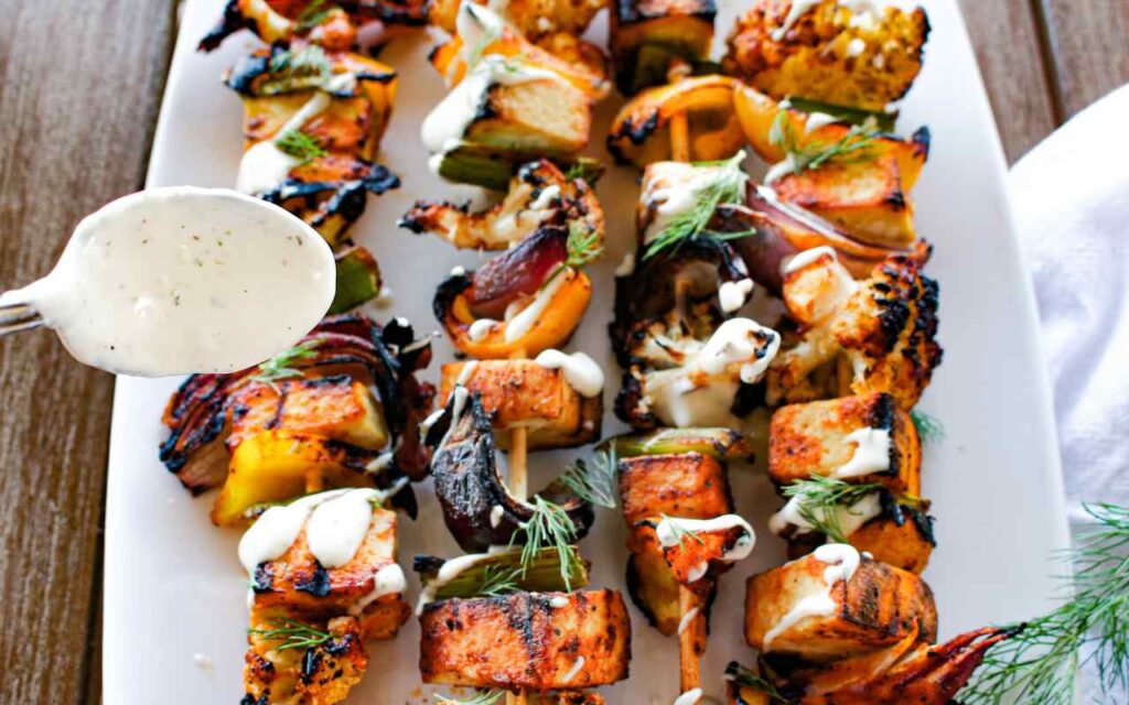 - Drizzle the skewers with 2 tablespoons of the vegan ranch dressing and sprinkle with fresh chopped dill or parsley (optional). Reserve remaining dressing to serve on the side as a dip for the skewers.