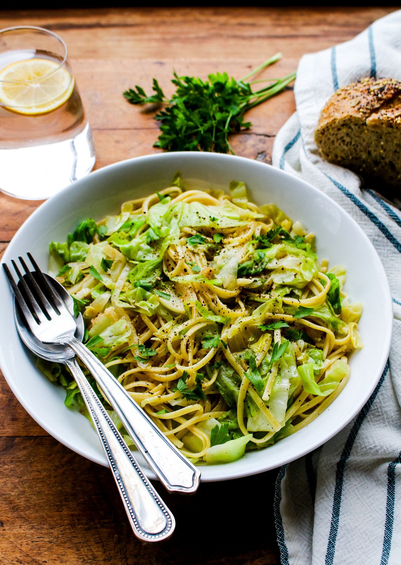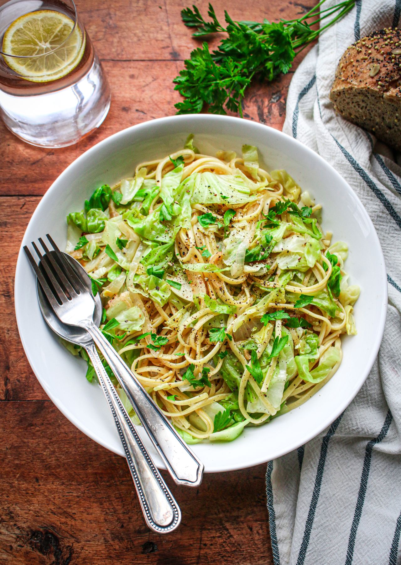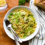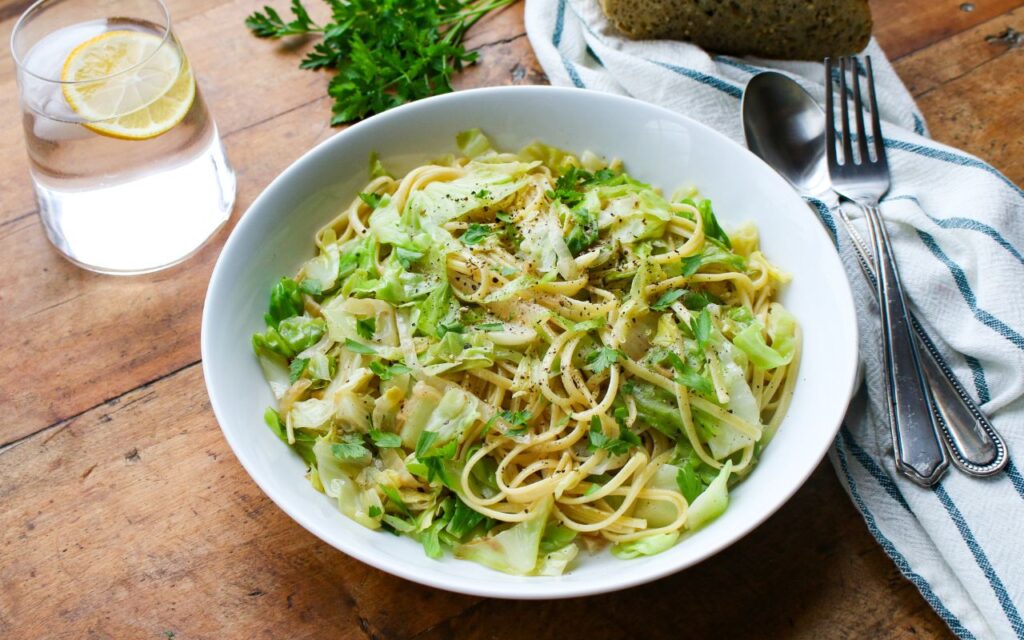 As a plant-based eater, I thoroughly enjoyed this cabbage dish during my time in Budapest, as restaurants happily recommended it as the perfect vegan option. I could enjoy a traditional recipe during my travels there, while avoiding animal products! Since that occasion, I have often thought back fondly on that delicious cabbage recipe. So when my garden produced a bounty of cabbage this spring, I decided to put it to good use! Please note that I am not a true expert in Eastern European cuisine, but used some inspiration from traditional recipes to inspire my own creation for this cabbage and noodles recipe, after doing a bit of research on the historic traditions of Eastern European cabbage and noodles dishes. I also heard from so many people about their own memories of cabbage and noodles, which I incorporated into this recipe. My family gave this recipe an enthusiastic thumbs up. Most traditions call for home-made haluski noodles made with eggs, but I used egg-free noodles (linguini pasta can work too), as well as vegan butter for this recipe to ensure it was completely plant-based. Some recipes call for bacon, so you could also add a bit of tempeh bacon to increase the protein content and savory quality of this recipe, if you so desire. Or simply serve it with some sautéed plant-based sausage on the side to truly make it a satisfying meal. You can also make this recipe gluten-free by using gluten-free noodles.