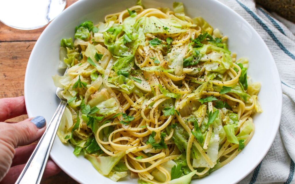 Cabbage and Noodles is a classic rustic dish in Central and Eastern Europe. Featuring just a few ingredients–caramelized cabbage, onion, and garlic tossed with noodles–this economical hearty vegan recipe is delicious and altogether comforting.