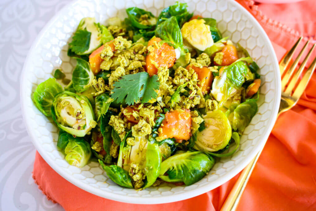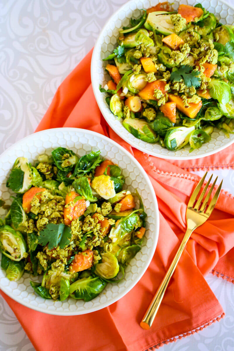 This Thai-inspired Coconut Curry Brussels Sprout Salad is flavored with papaya, a crunchy granola topping, and a flavorful vinaigrette—it’s healthy, delicious, plant-based (vegan), and gluten-free.