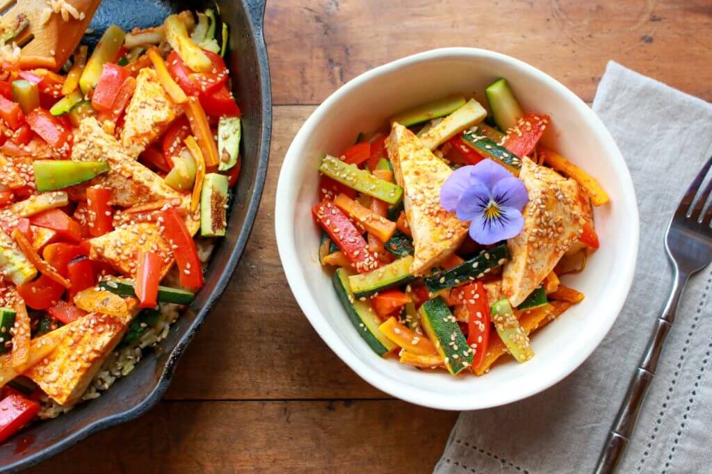 In Asian countries, like Japan, Thailand, Indonesia, and China, the high protein combination of soyfoods (like tofu or tempeh) and rice is very common. Tofu made from soybeans is a high-quality plant protein eaten frequently in these diet patterns in many ways, including stir-fries and soups served with rice or rice noodles. There are usually lots of regional vegetables that are served at the meal with tofu or tempeh, including fermented pickles, greens, turnips, peas, and carrots. Follow suit by combining soyfoods in your favorite veggie-rich dishes, such as a Bibimbap rice skillet, tofu rice noodle pho, and tempeh noodle skillet.