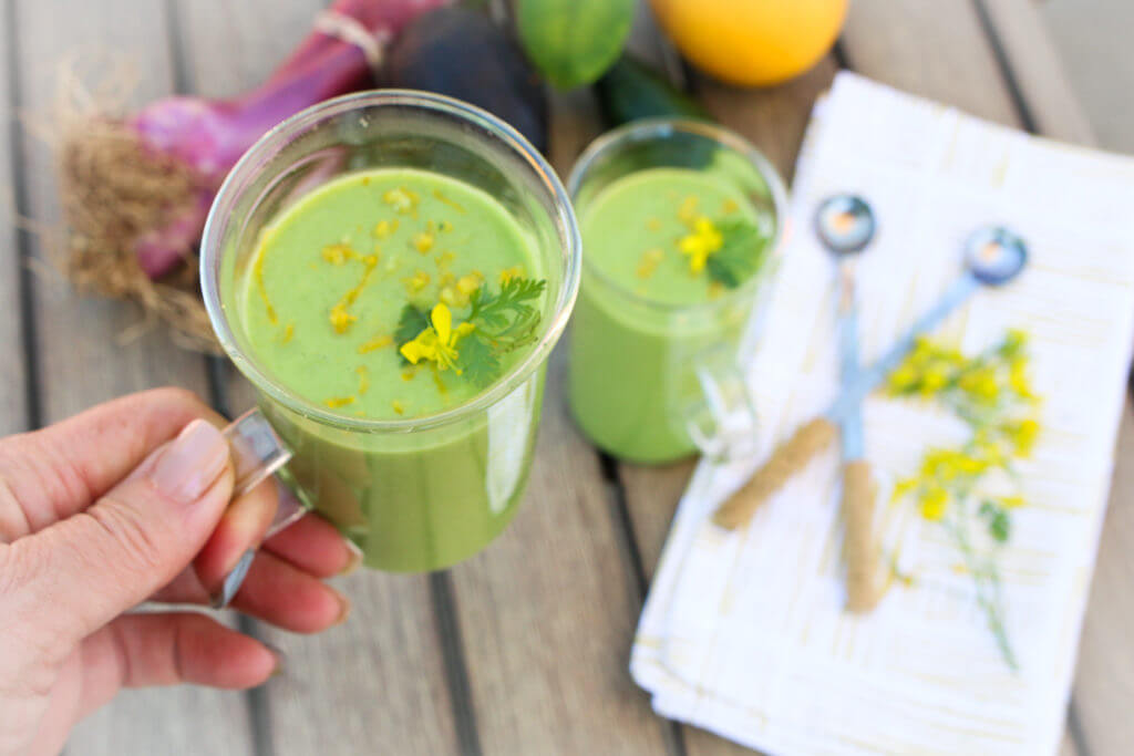 You don’t have to give up enjoying soup when the weather turns warm! Just cool it down a notch. This easy Cucumber Avocado Cold Soup (which is vegan, oil-free, and gluten-free) is as yummy as it is pretty—thanks to the verdant shades and flavors of cucumber, avocados, green onions, citrus, and cilantro in the mix. You can whip up this light, cool, creamy cucumber soup in 15 minutes (no cooking required)—and it makes a lovely party appetizer course served in shot glasses. I love to serve this chilled avocado soup in small portions in small glasses—garnished with fresh lemon or lime and cilantro. But it’s also a really refreshing starter course, served in larger soup bowls or clear mugs, too.