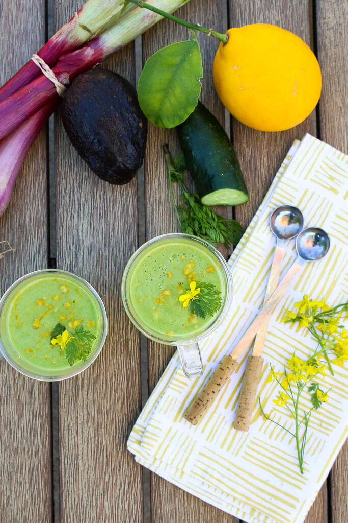 I am super lucky, as I have most of these ingredients growing in my garden—citrus, avocados, cilantro, cucumbers, peppers, and green onions. If you don’t have them on hand, you can easily get all of these ingredients at your neighborhood supermarket or farmers market. With only 7 ingredients, you can whip up all of these delicious, whole, plant foods into this creamy soup in minutes. Remember, for pureed soups, you don’t have to spend a lot of time chopping (and cooking—as the ingredients in this recipe are raw), which means a big savings of time in the kitchen. Plus, the nutritional line-up of this recipe is awesome—including healthy fats, phytochemicals, vitamins, minerals, and more. But it’s light enough that it won’t weigh you down.