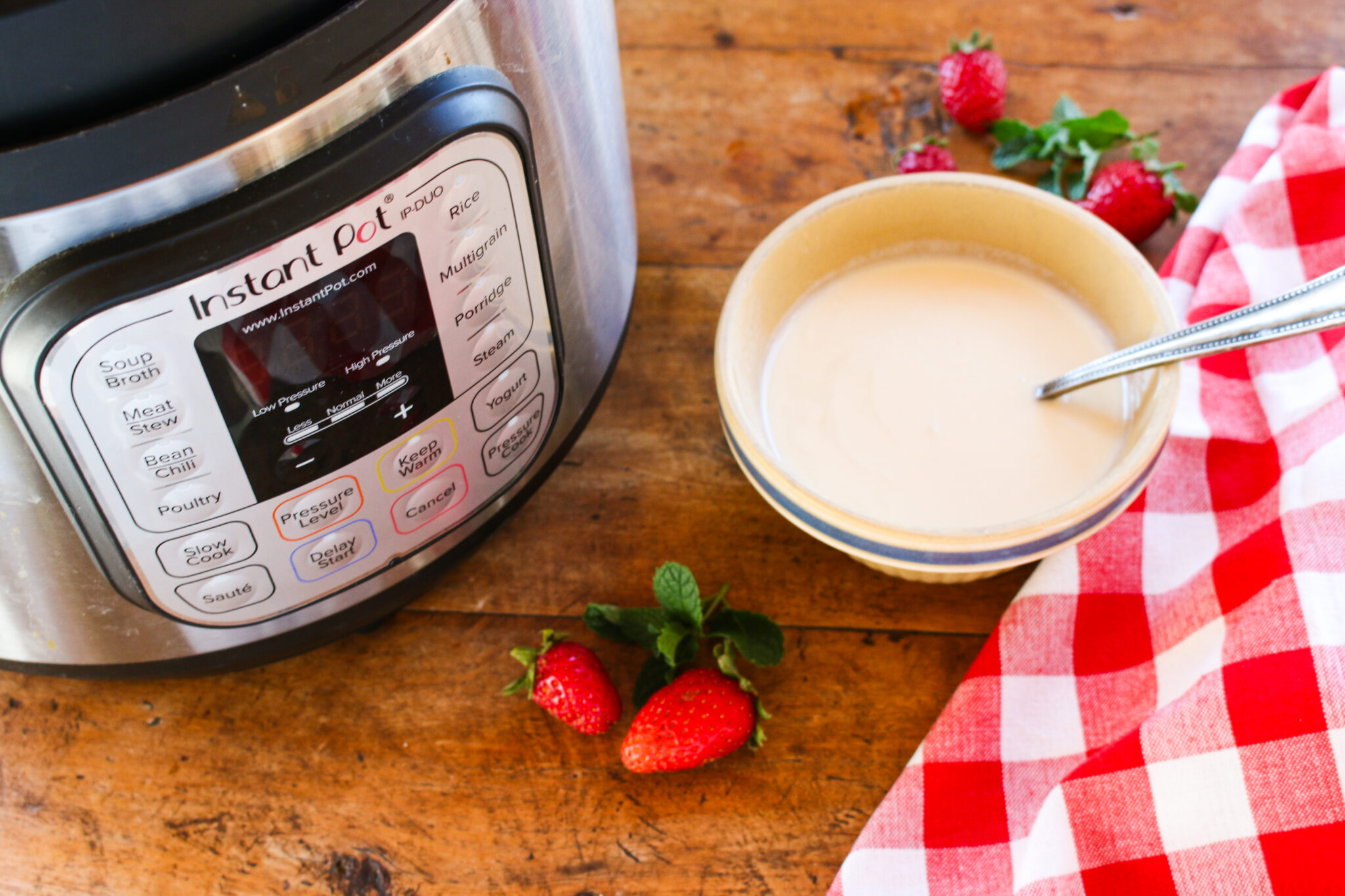 4. Cover with the lid of the Instant Pot, fasten it well, and press the Yogurt setting (about 8 hours of low temperature cooking designed for culturing yogurt).