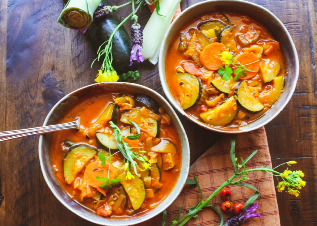 Filled with vegetables, including leeks, carrots, celery, and zucchini, with a flavorful tomato-curry vegetable broth, this 10-ingredient soup is based on refrigerator and pantry staples, so it’s easy to make up on a busy night. You can swap out leeks for white, yellow, or red onions, and substitute a different vegetable for zucchini, such as peas, spinach, or broccoli. You can also use frozen vegetables to save time and money when produce is less available.