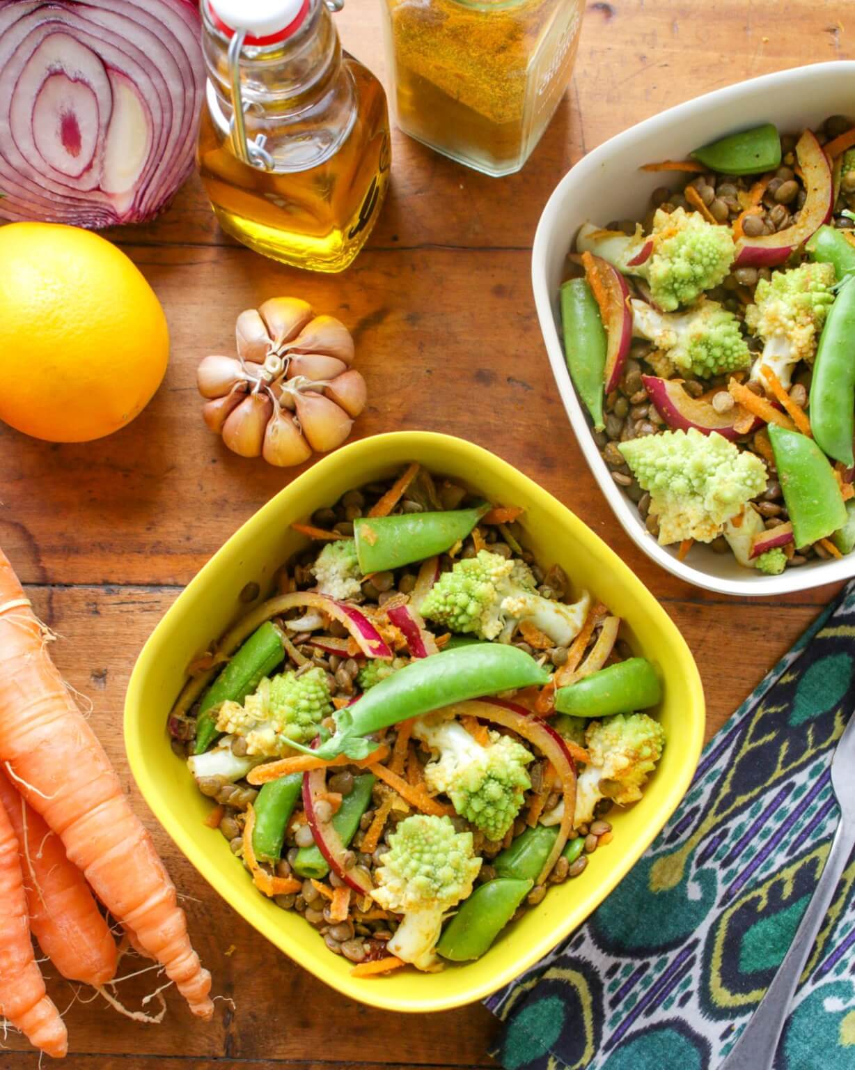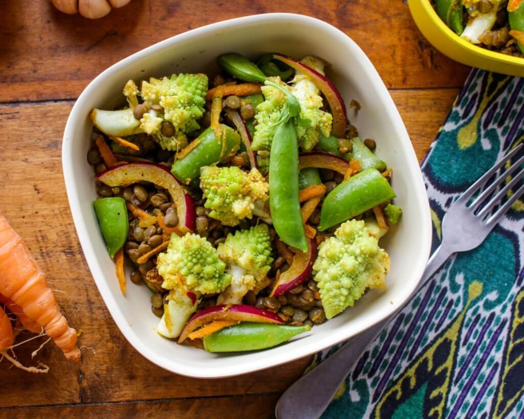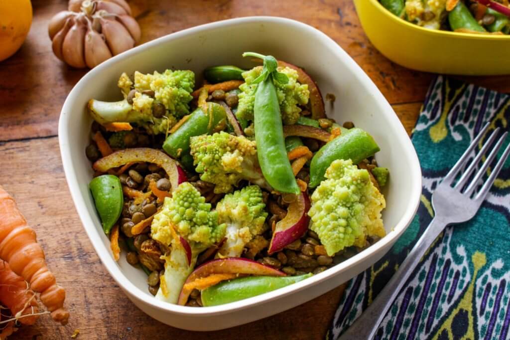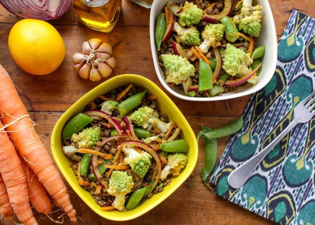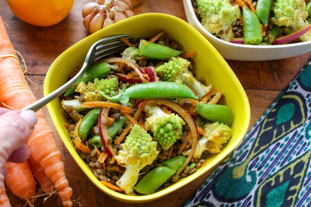 Healthy Curried Lentil Salad with Cauliflower and Snap Peas