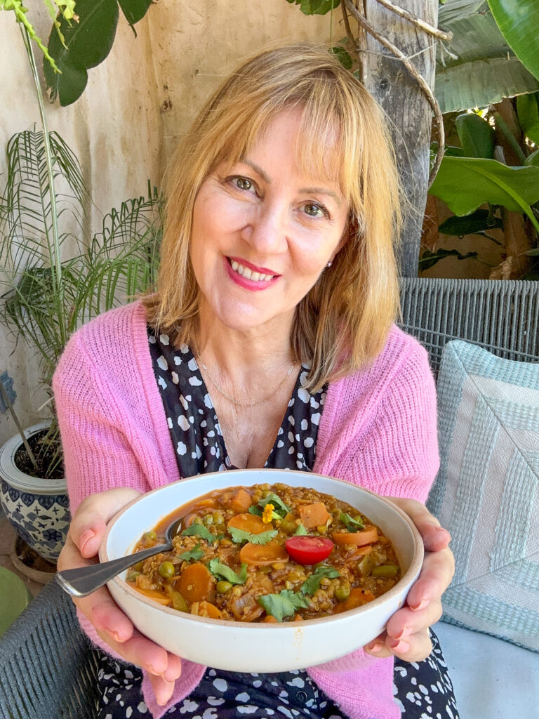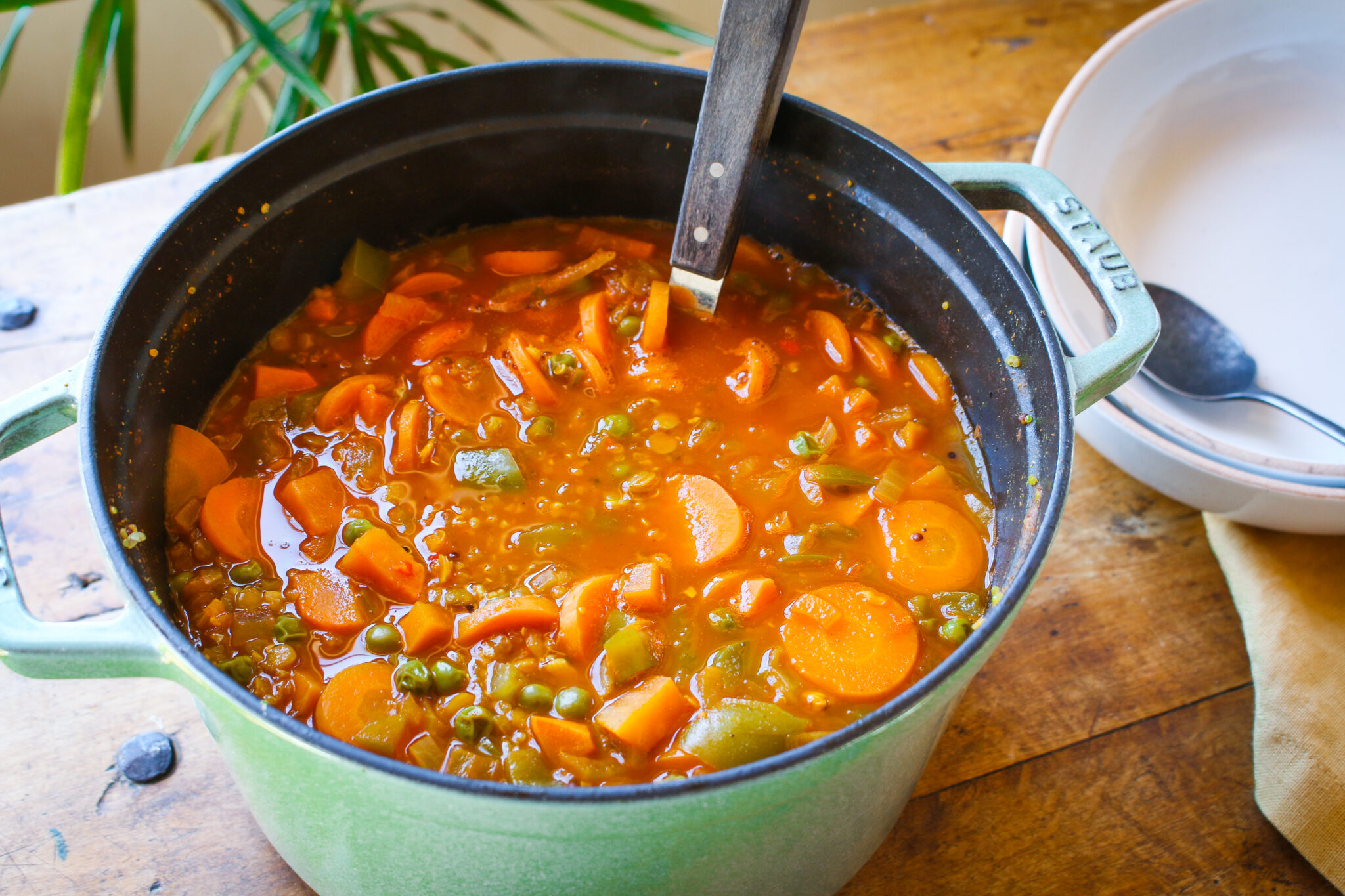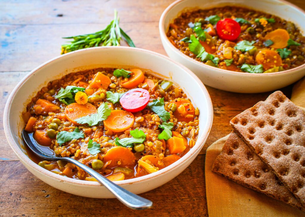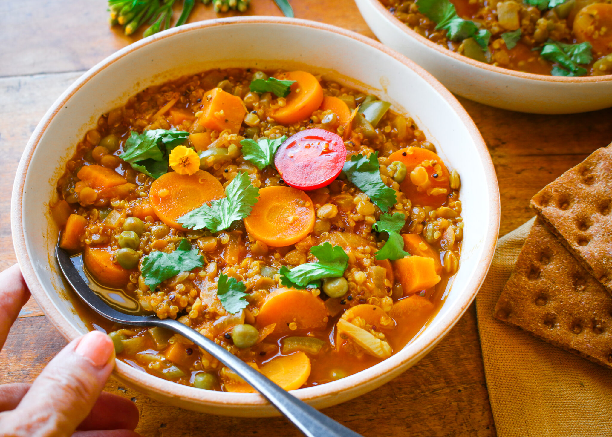 This super easy, vegan, gluten-free Curried Lentil Quinoa soup recipe is vibrant with the addition of lentils, quinoa, sweet potatoes, peas, carrots, and spices to give it a rich flavor and nutrition profile.