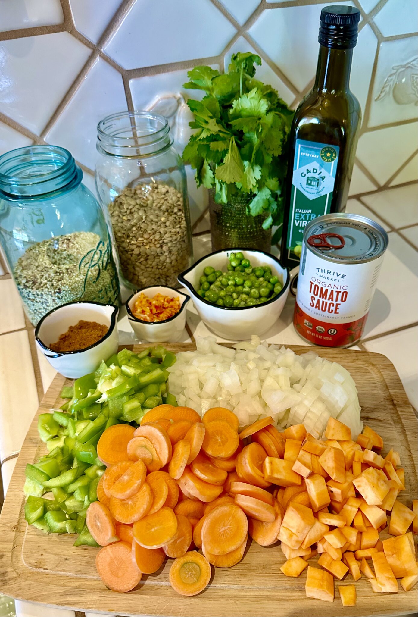 - Add onions, bell pepper, sweet potato, and carrots and sauté for 4 minutes.