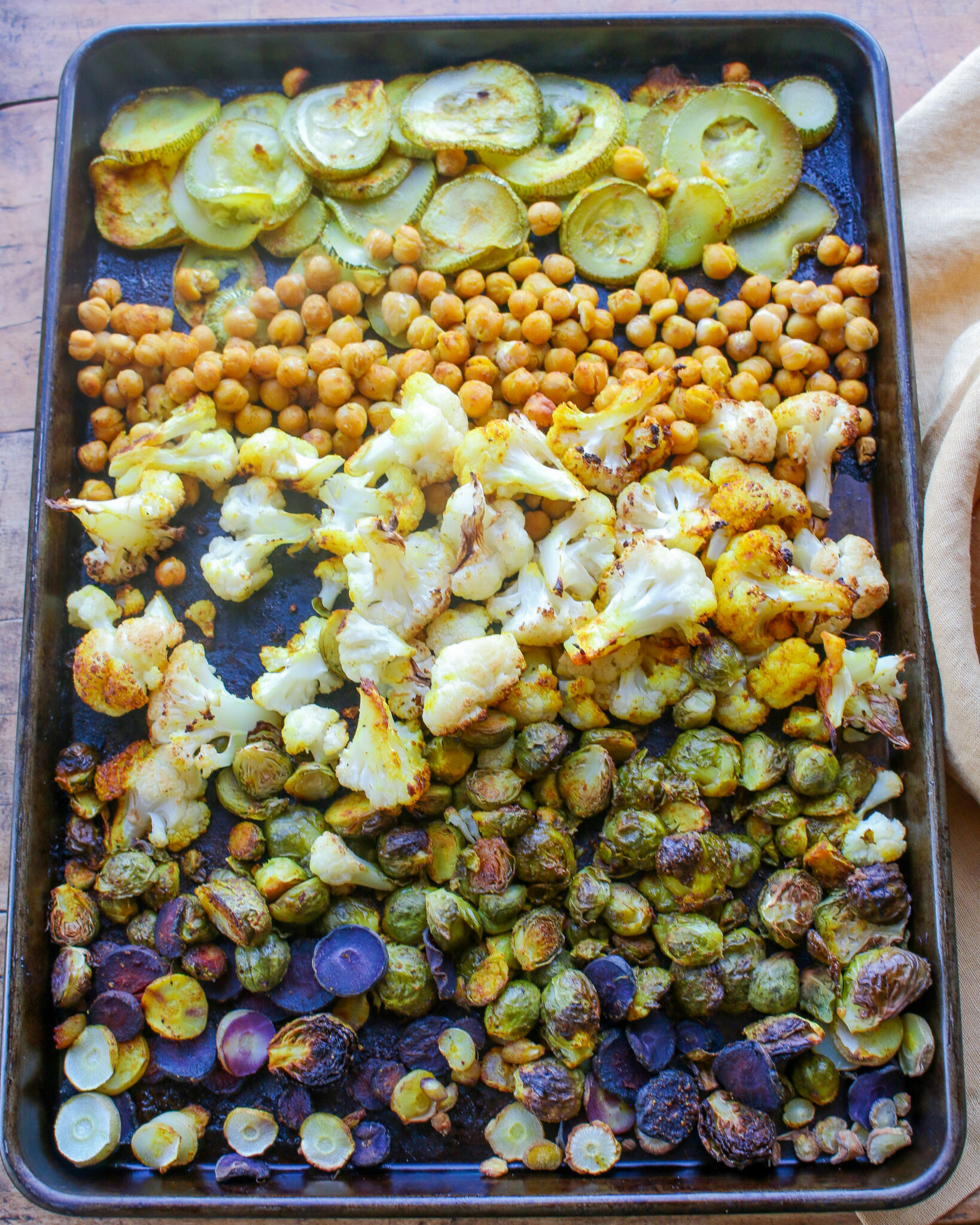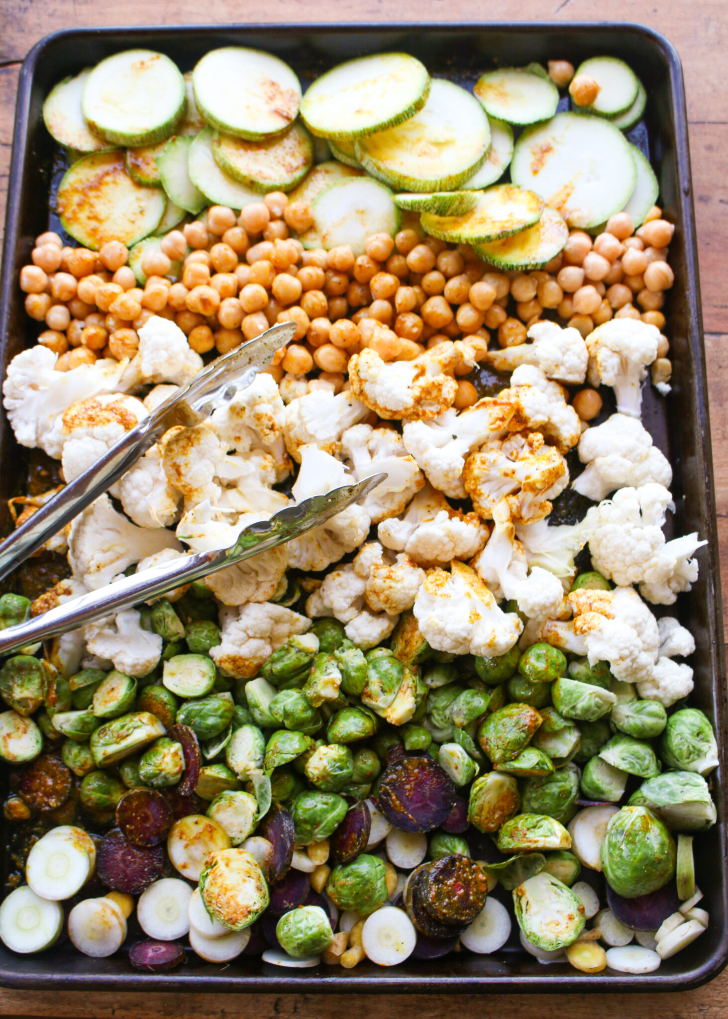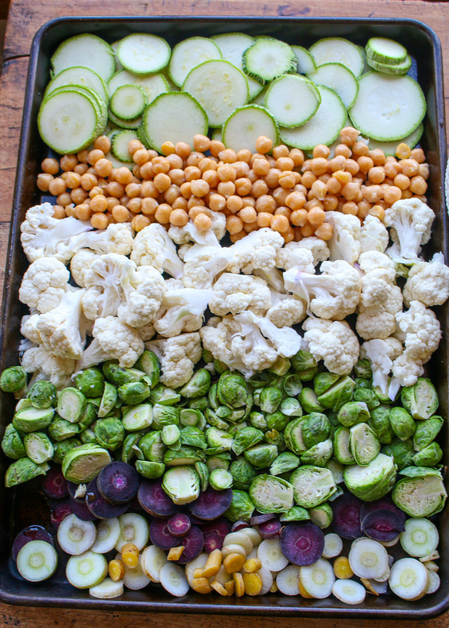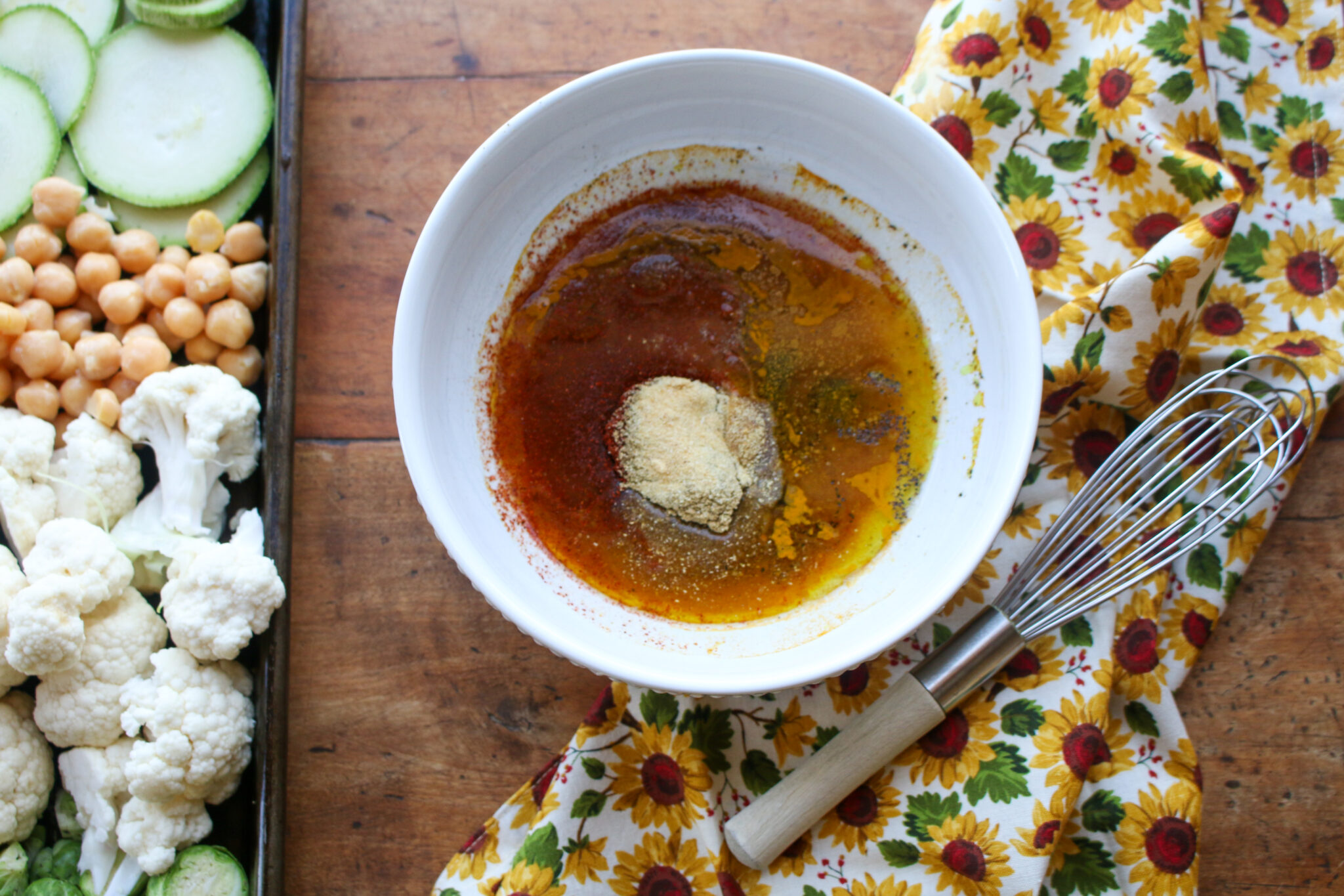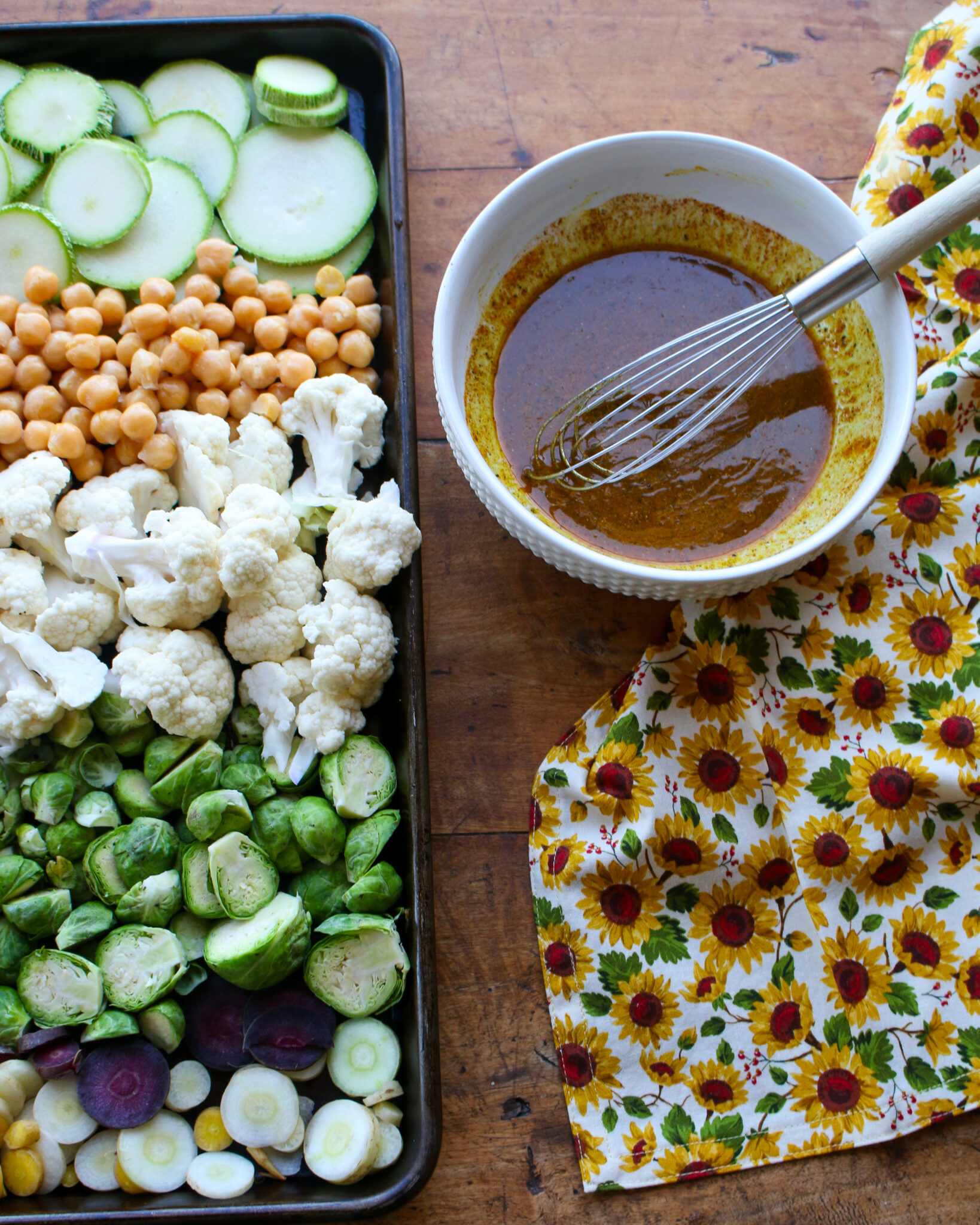 - While triticale is cooking, prepare roasted vegetables and curry marinade. Preheat oven to 375 F. Arrange cauliflower florets, halved brussel sprouts, sliced carrots, sliced zucchini, and chickpeas on a baking sheet.