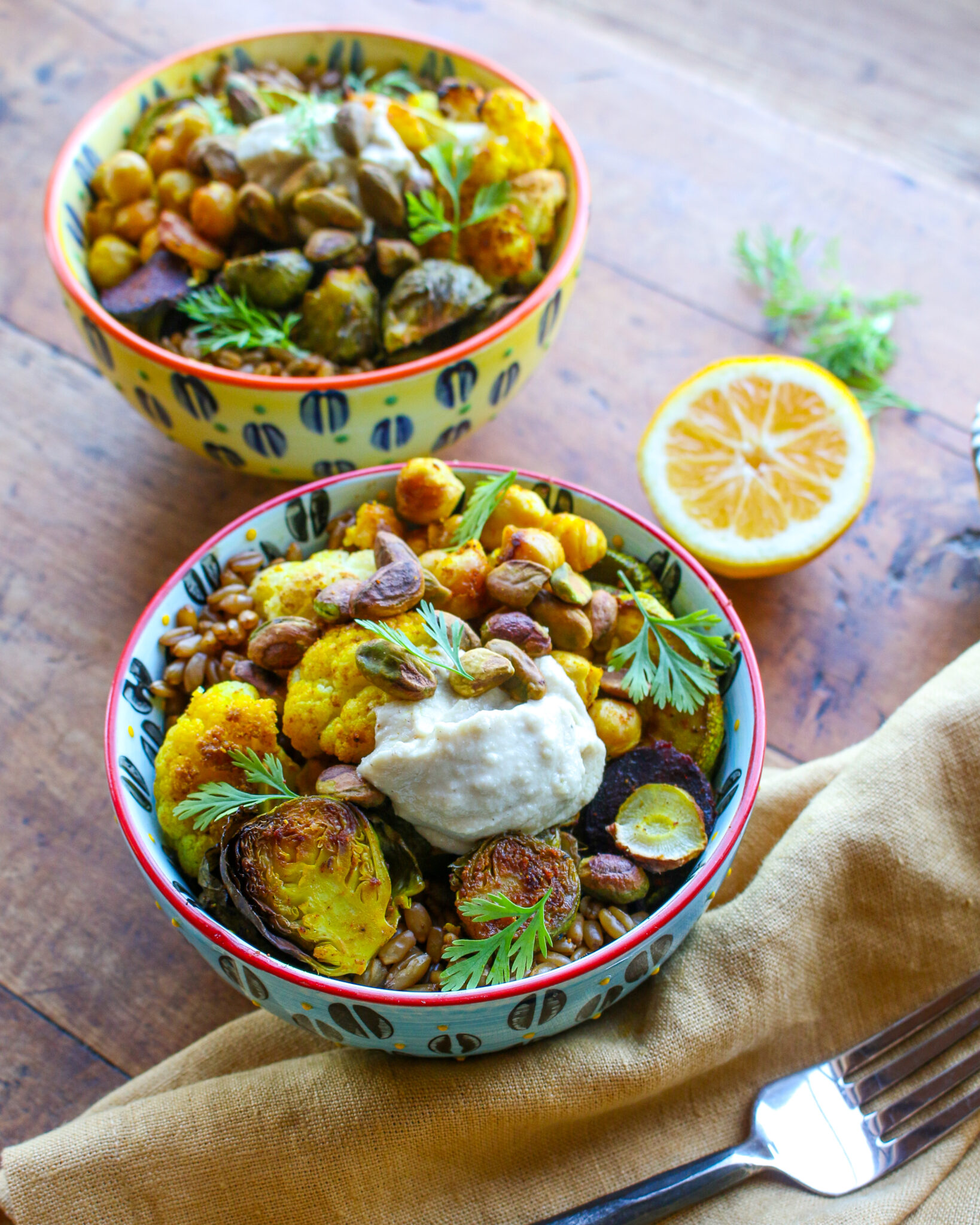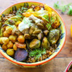 Filled with chewy whole grain triticale; roasted curried chickpeas, cauliflower, brussel sprouts, carrots, and zucchini; and a creamy tahini ginger sauce, this delicious Curried Triticale Harvest Bowl is completely plant-based (vegan) and packed with nutrition power.