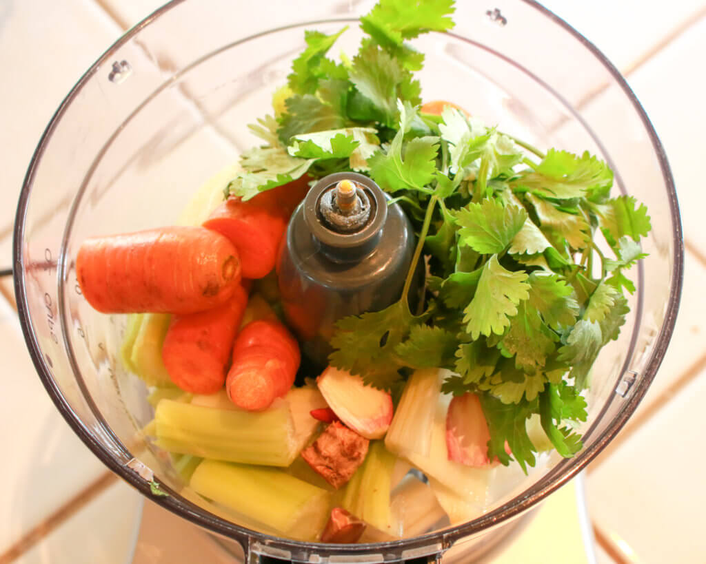 - Place carrots, onion, celery, cilantro (if using dried, add in step 2), garlic, ginger, turmeric (if using dried, add in step 2), and jalapeno pepper in the container of a food processor. Process just until vegetables are chopped finely but not liquified. May need to pause and scrape down sides. (If you don’t have a food processor, chop finely by hand.)