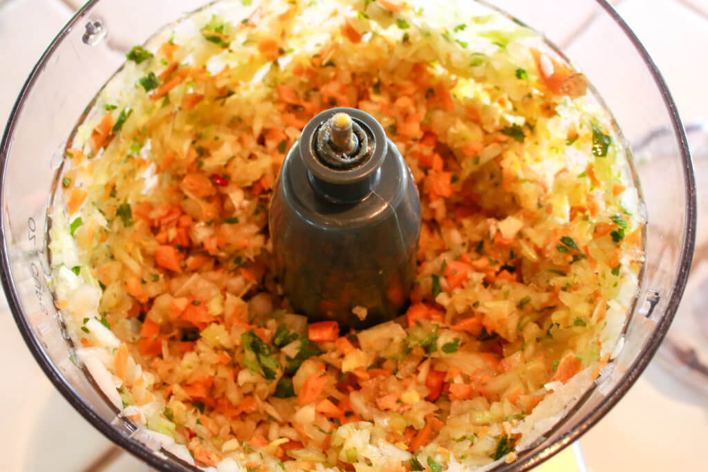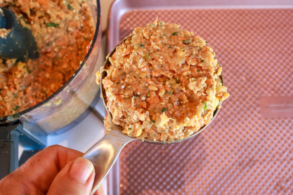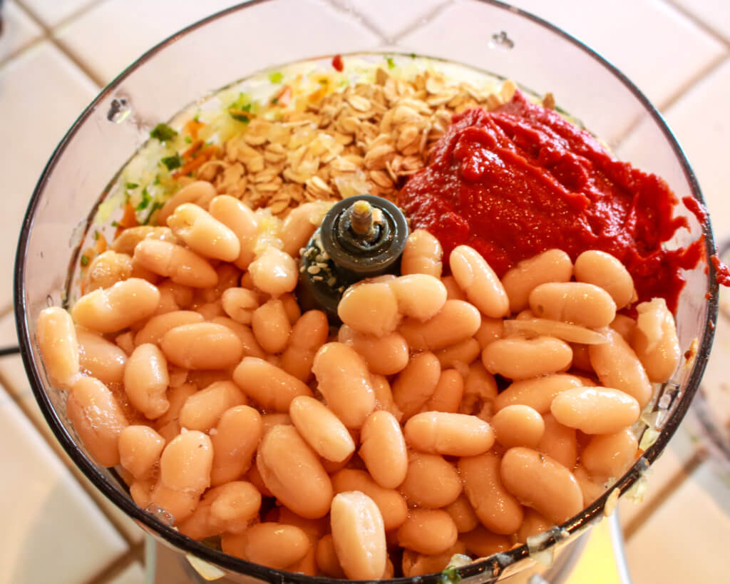 - Add white beans, oats, chia seeds, hemp seeds, cumin, soy sauce, lemon juice, and tomato paste to the food processor container. Process until mixture is smooth and well combined but not liquified. (If you don’t have a food processor, mash beans and combine with chopped vegetables in a large mixing bowl.)