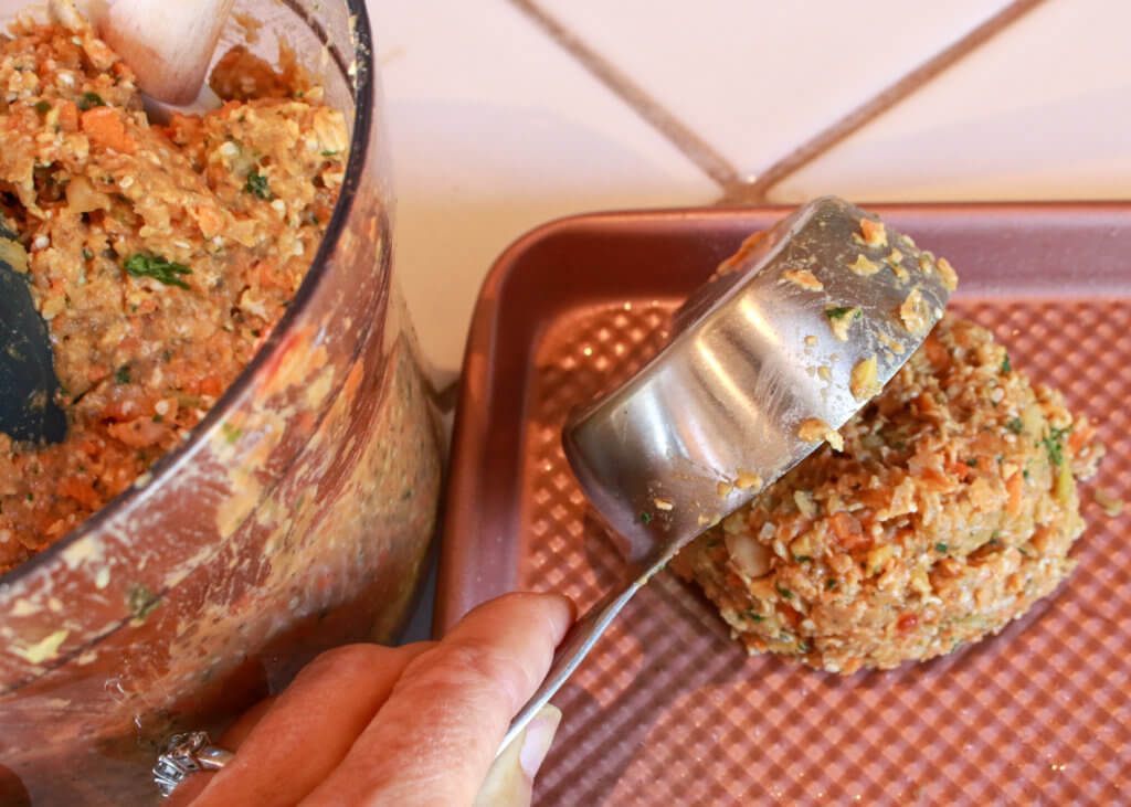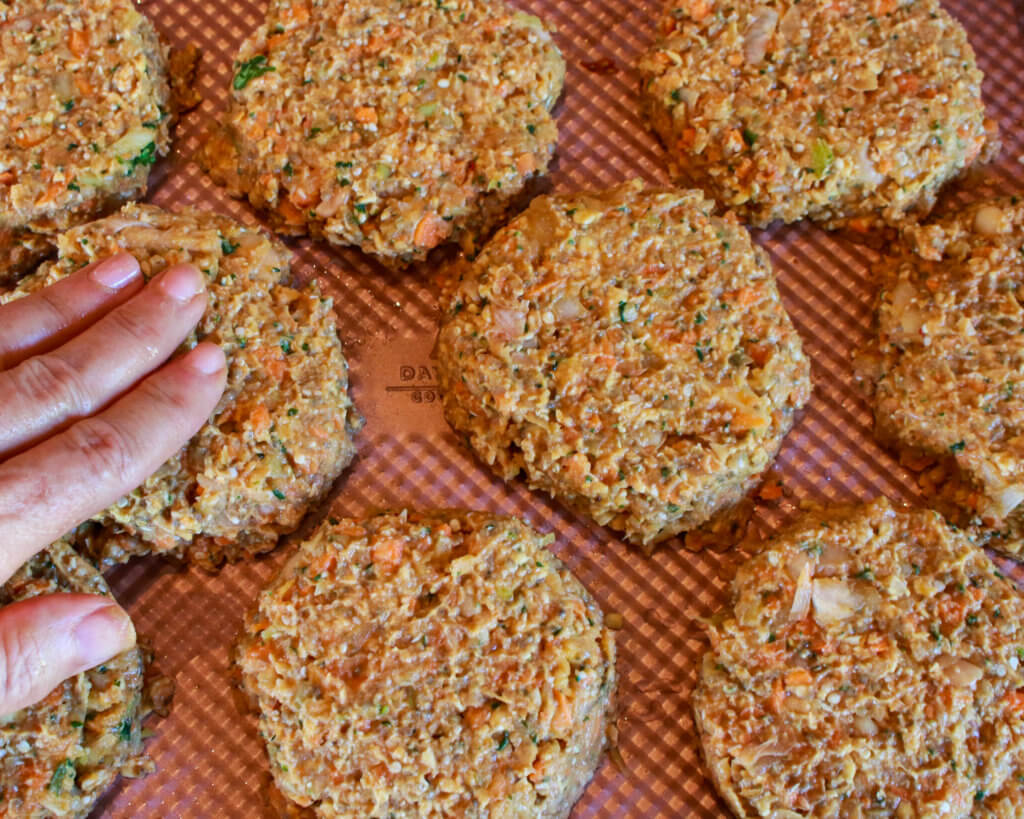 - Spray a baking sheet with nonstick cooking spray. Scoop up veggie burger batter with a half-cup measuring cup and firmly turn out on the baking sheet, patting with hands to form a round patty approximately 1-inch thick. Repeat to make a total of 8 patties.