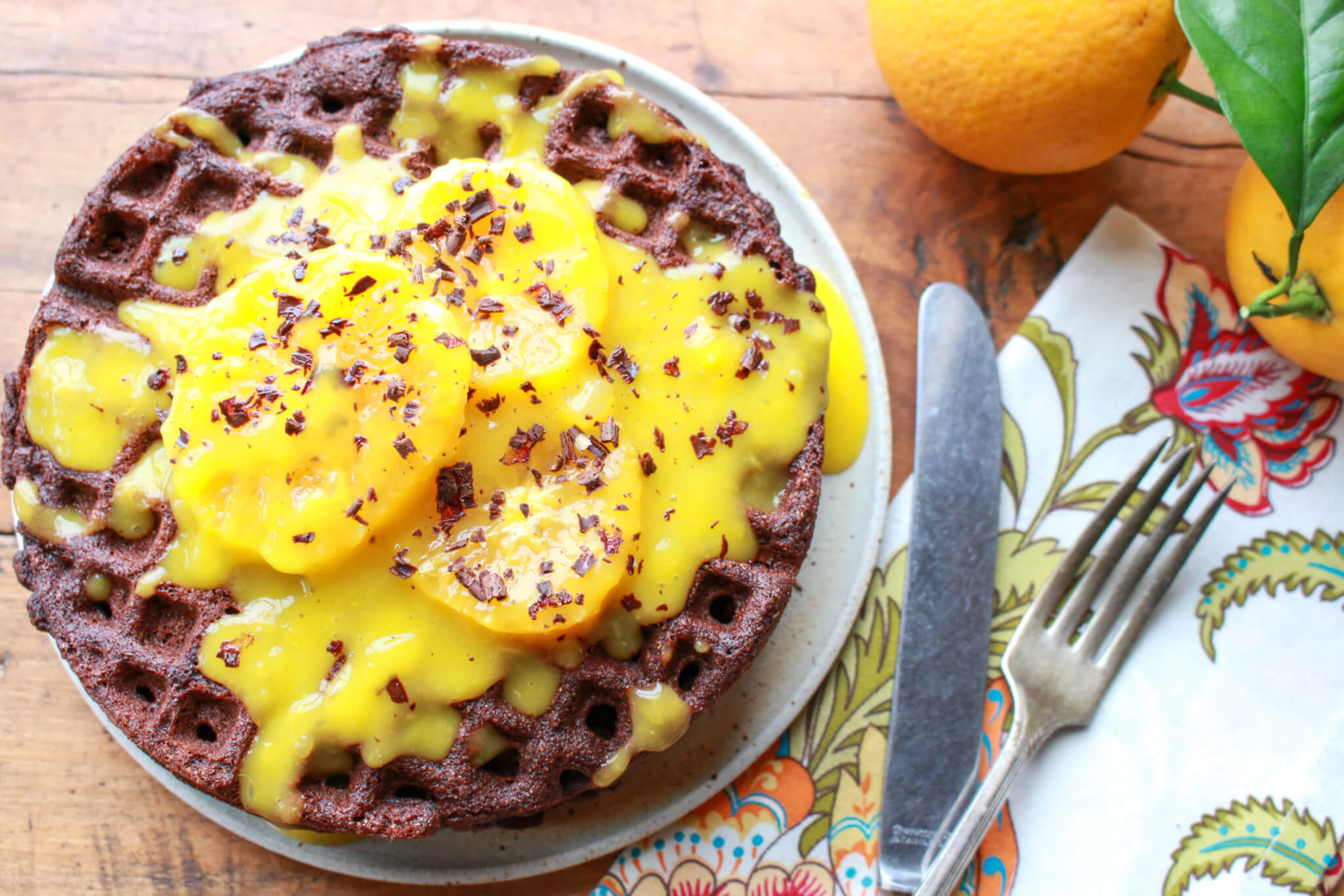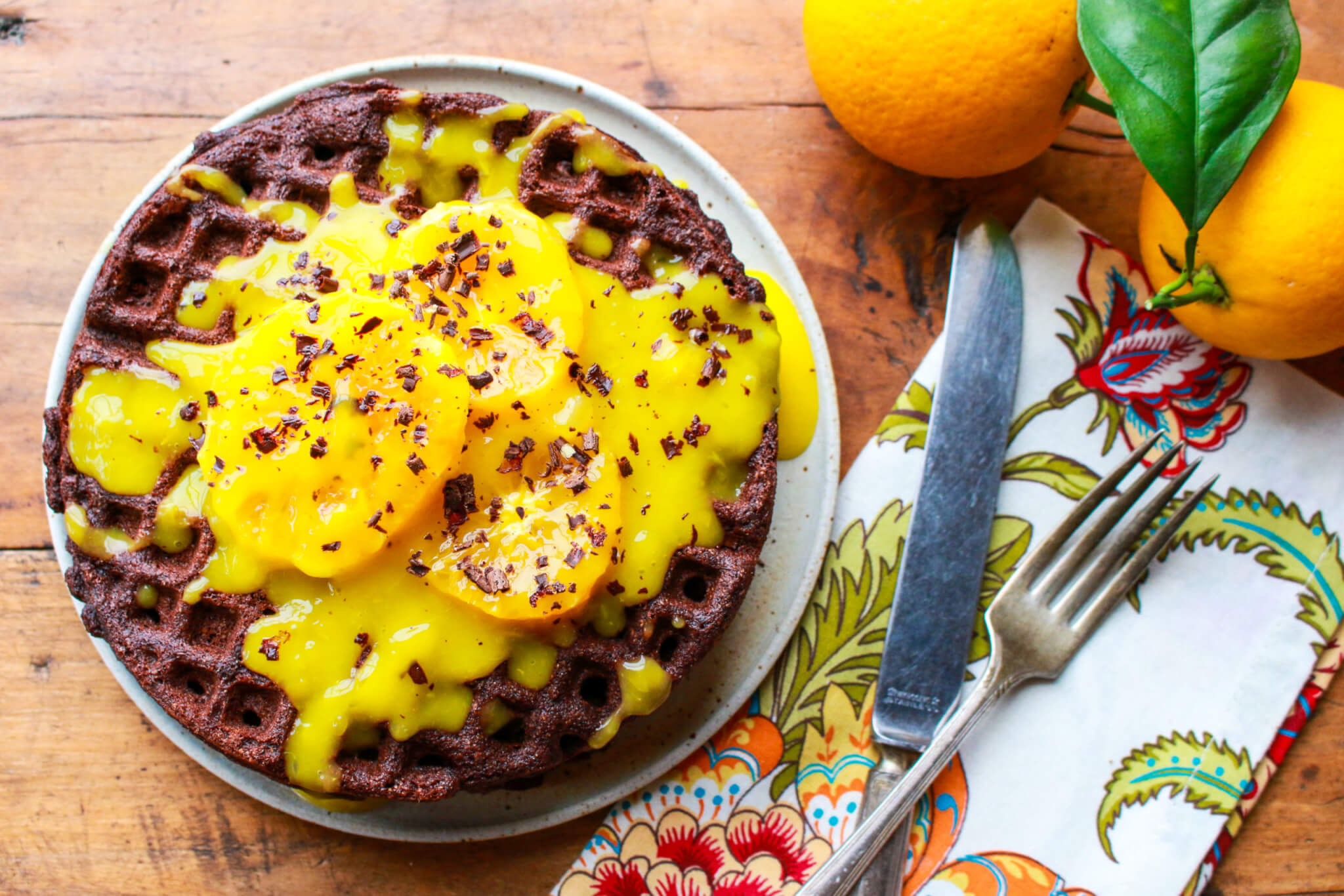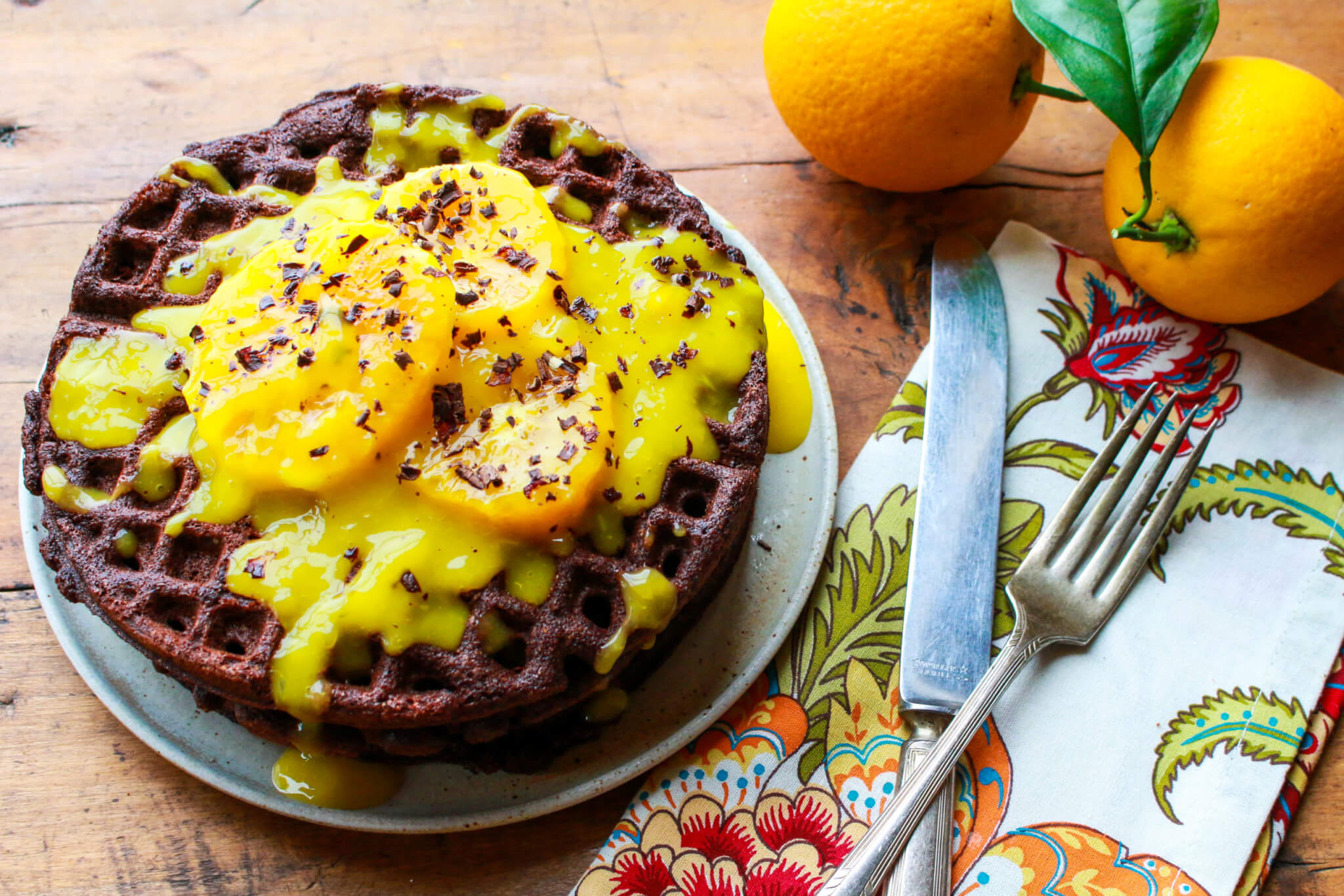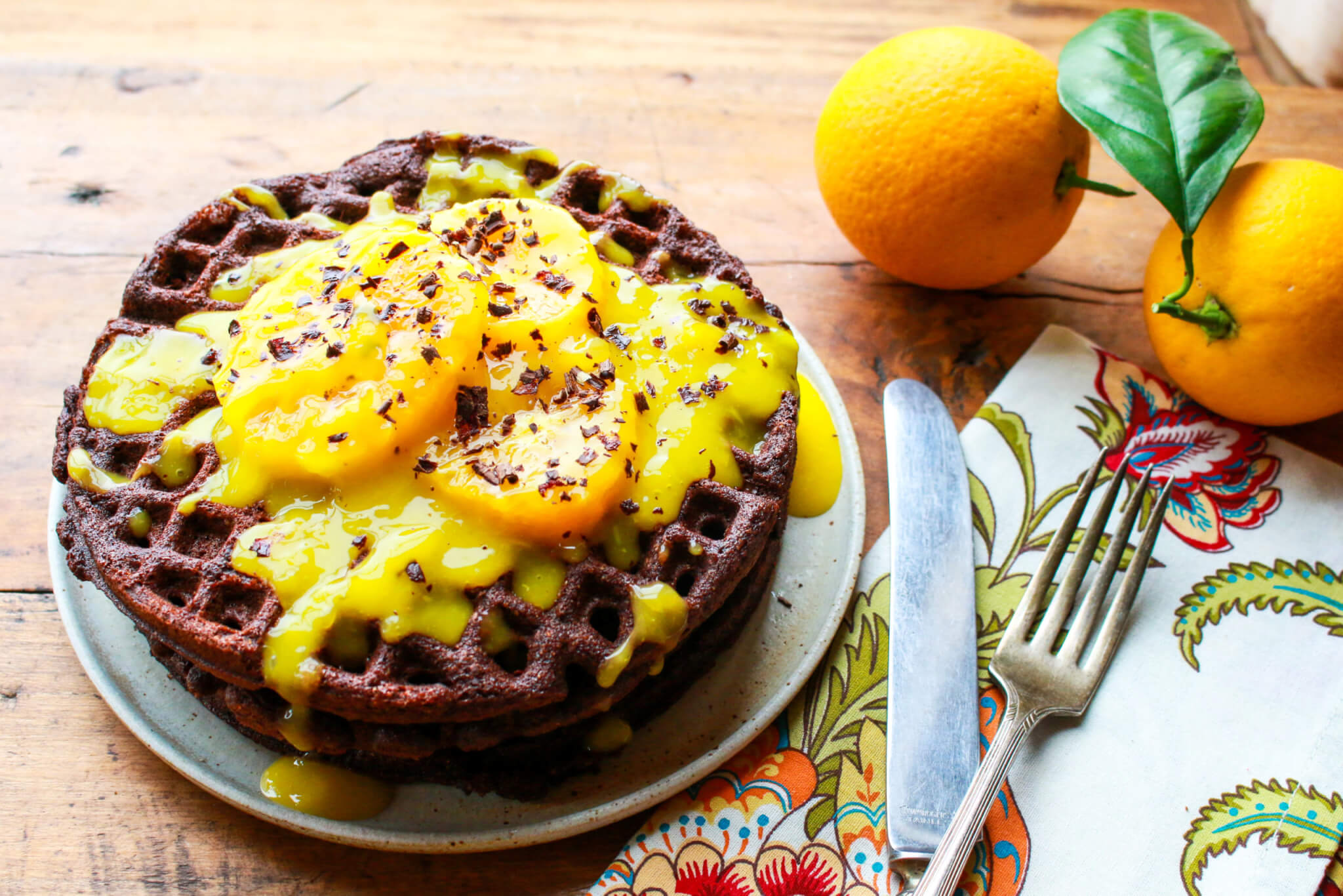 Call upon the gorgeous combo of dark chocolate and orange in these vegan, whole grain waffles that are rich in flavor and as pretty as can be.