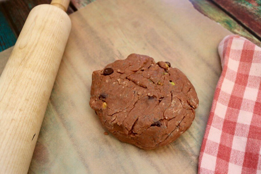 - Remove the dough from bowl and divide into two equal parts. On parchment paper, roll out each piece of dough to a rectangle approximately 4-inches wide by 11-inches long by 1-inch thick.