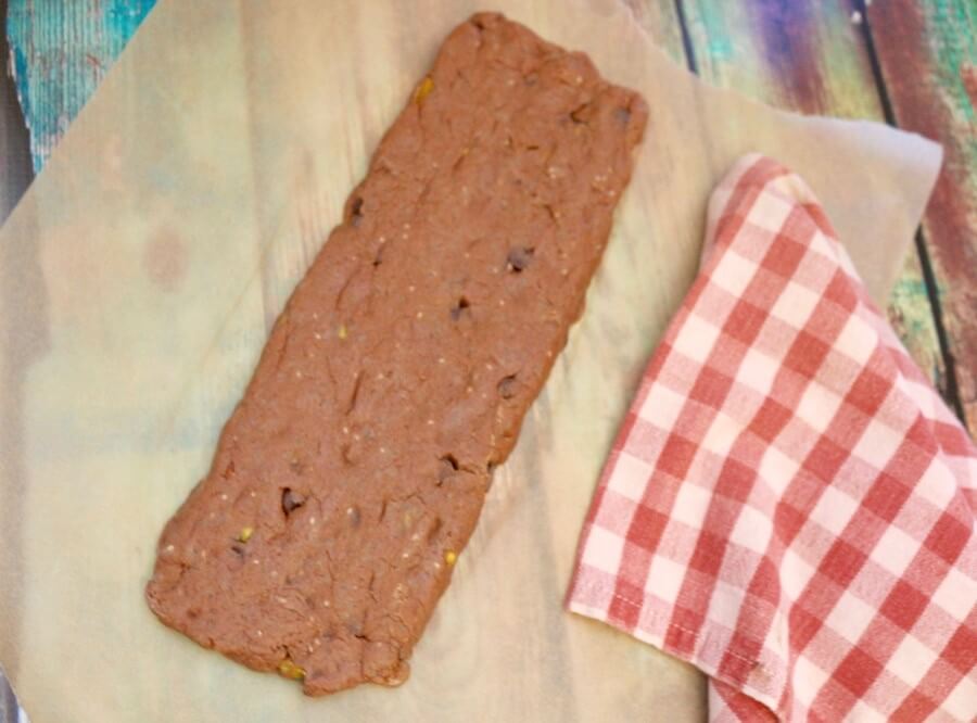 - Reduce temperature to 300 F. Remove dough rectangles from oven, and allow to cool slightly to handle. Slice into ½-inch thick strips and place on the parchment paper lined baking sheets with cut side facing up.