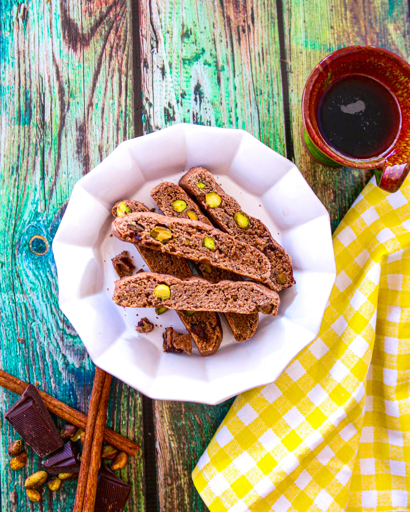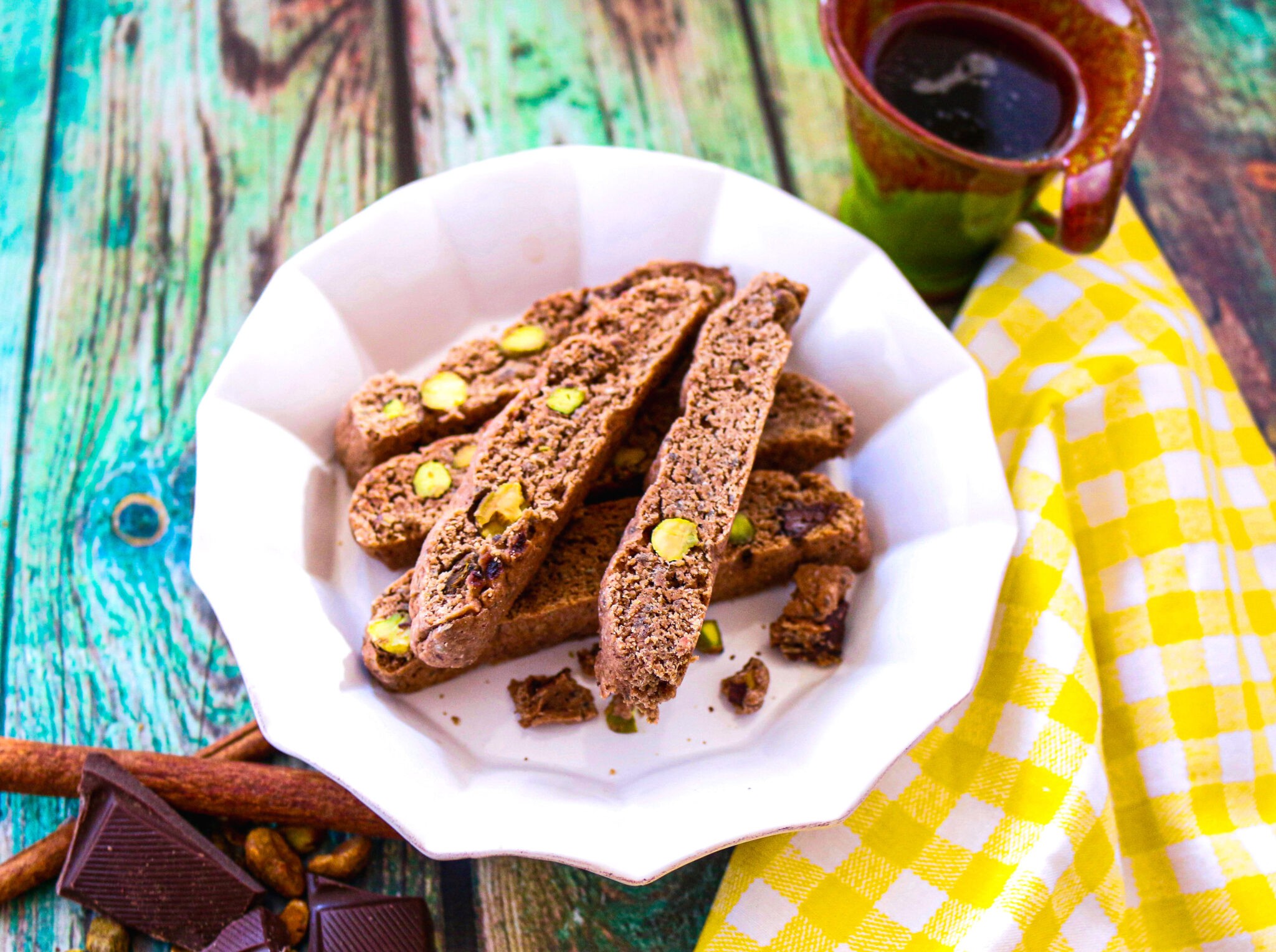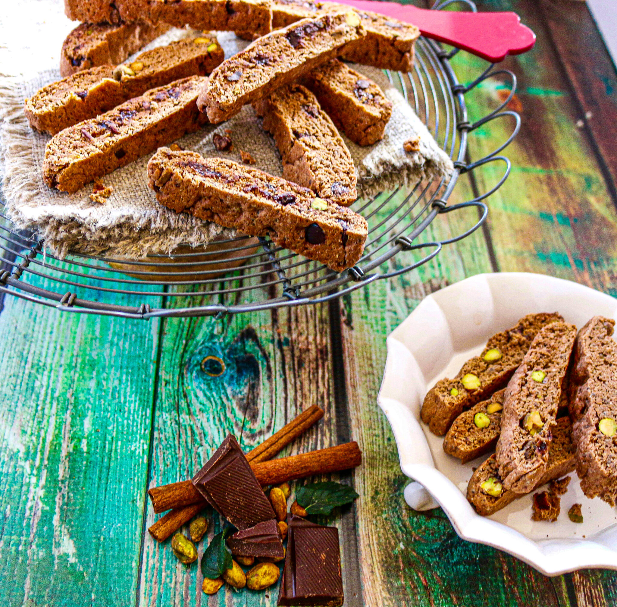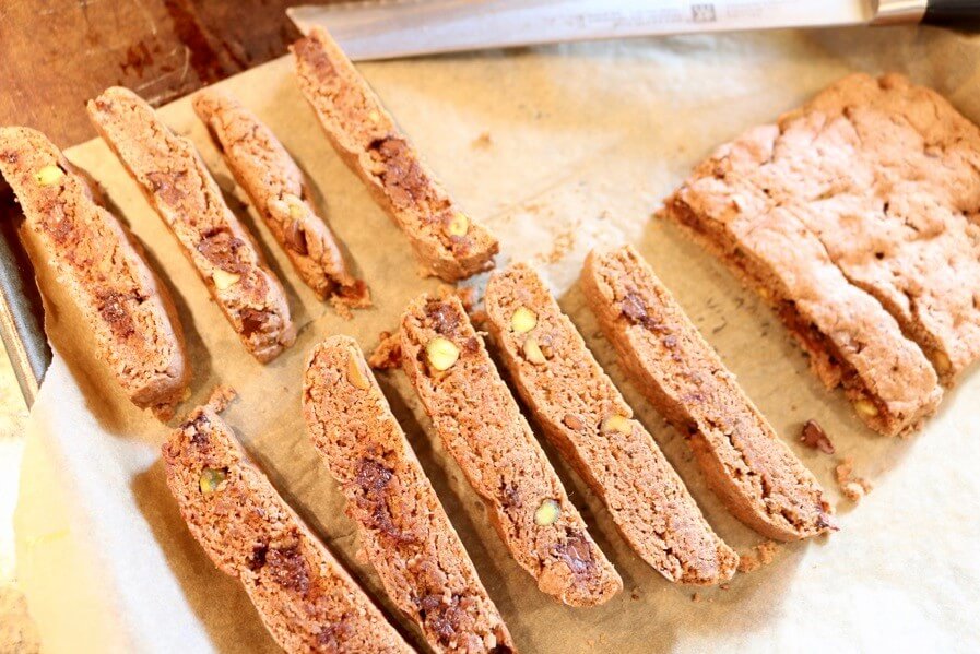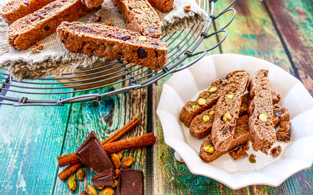 These vegan Dark Chocolate Pistachio Biscotti are light, crisp, and delicious. Made with cocoa powder, chia seeds, pistachios, and a touch of sugar using classic Italian baking techniques. Perfect for gifting and holiday baking.