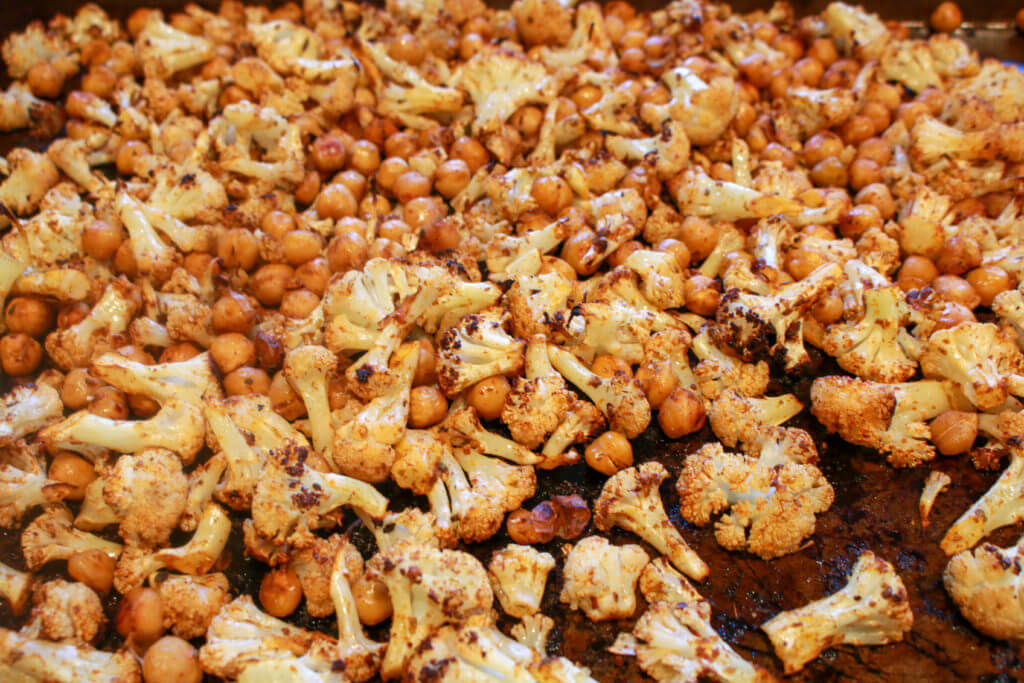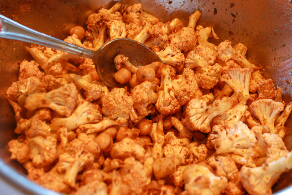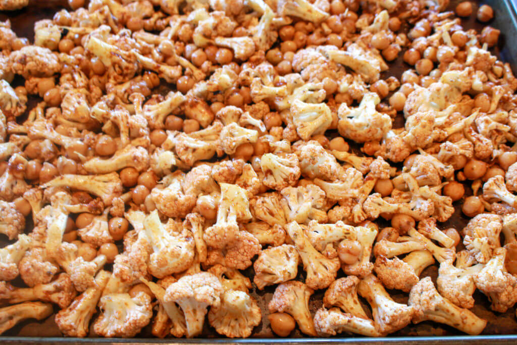 - While cashews are soaking, prepare the Roasted Cauliflower Chickpea Taco Filling: Preheat the oven to 400 F. Place cauliflower florets and chickpeas in a large bowl. Add olive oil, lemon juice, garlic, chili powder, cumin, oregano and salt (optional), and combine well. Spread into a baking sheet, and place in oven. Roast for about 20-25 minutes, until golden brown.