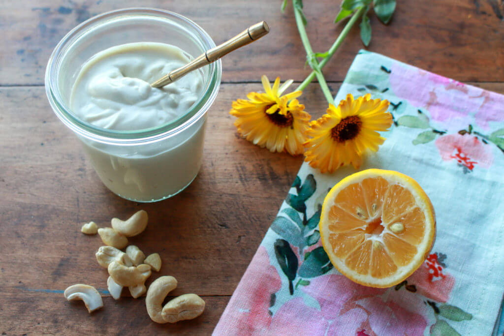 - To make cashew crema: Place raw cashews in a small dish, cover with boiling water, and soak for 15 minutes. Drain off the water, and add cashews, lemon juice, garlic, and white pepper to a small blender container. Add ¼ cup of the plant-based milk, and process the cashew crema until smooth. Add additional plant-based milk as needed to create a smooth, creamy texture. If desired, season with a pinch of salt (optional). Transfer to serving dish. Makes about 2 ¼ cups.