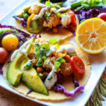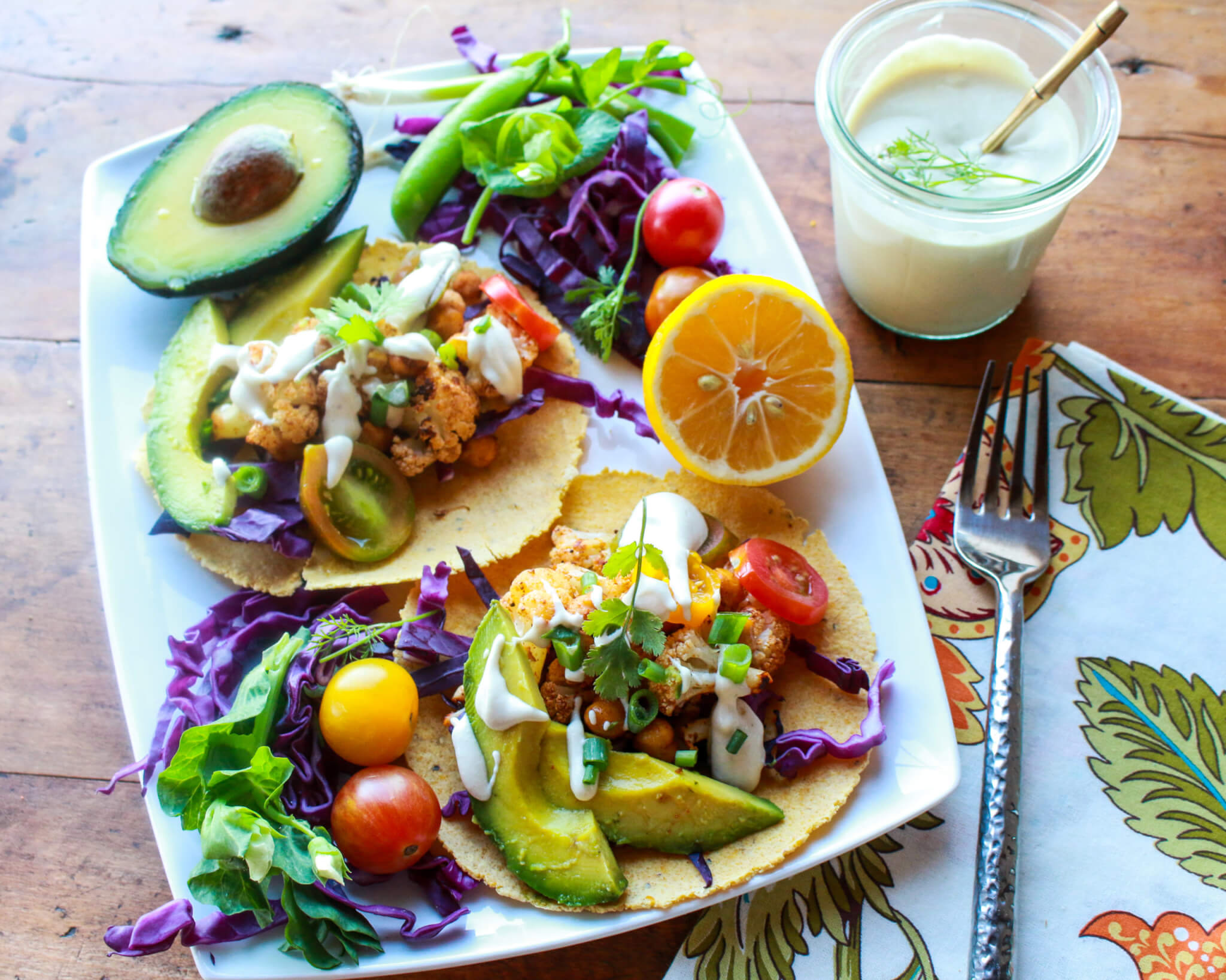 - To prepare tacos: layer each corn tortilla with ¼ cup cabbage, ½ cup cauliflower and chickpeas filling, 2 slices avocado, 4 cherry tomato halves, 3 tablespoons cashew crema, 1 tablespoon cilantro, and 1 tablespoon green onions.