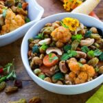 - Stir well, and add peas, chickpeas, and cauliflower. Press the “sauté” button and sauté, stirring frequently, for about 5-10 minutes, just until vegetables are at desired tenderness. If the mixture gets too dry, may add 1-2 tablespoons of water, if needed.