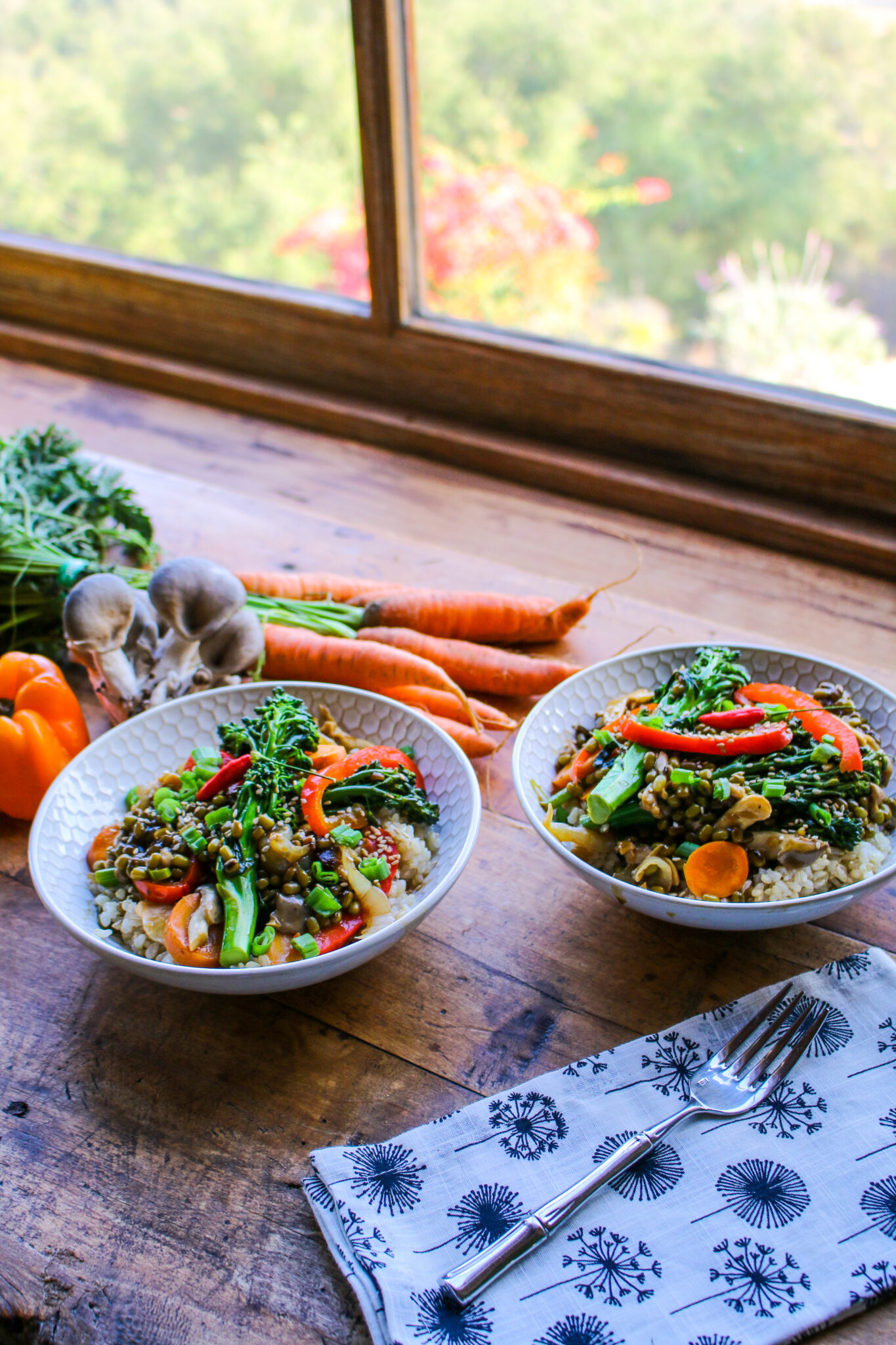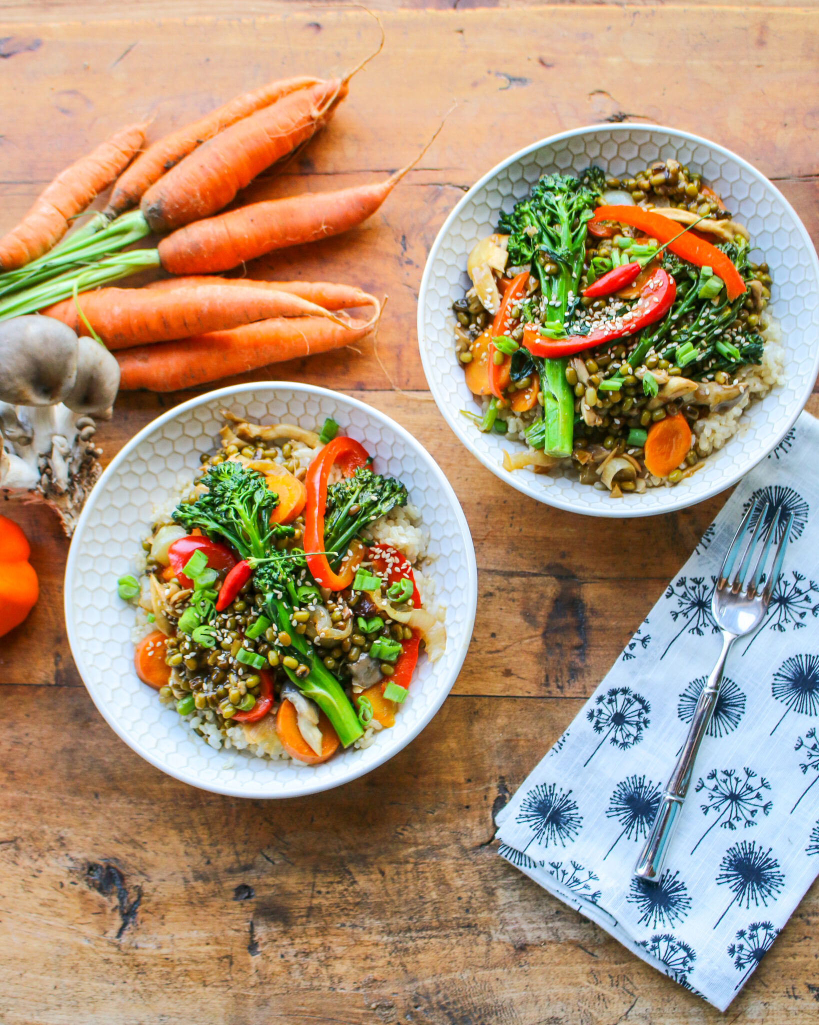 This one-skillet mung bean stir fry with brown rice is a healthy, vegan, and gluten-free meal made with real, whole ingredients. Quick, hearty, and nourishing!