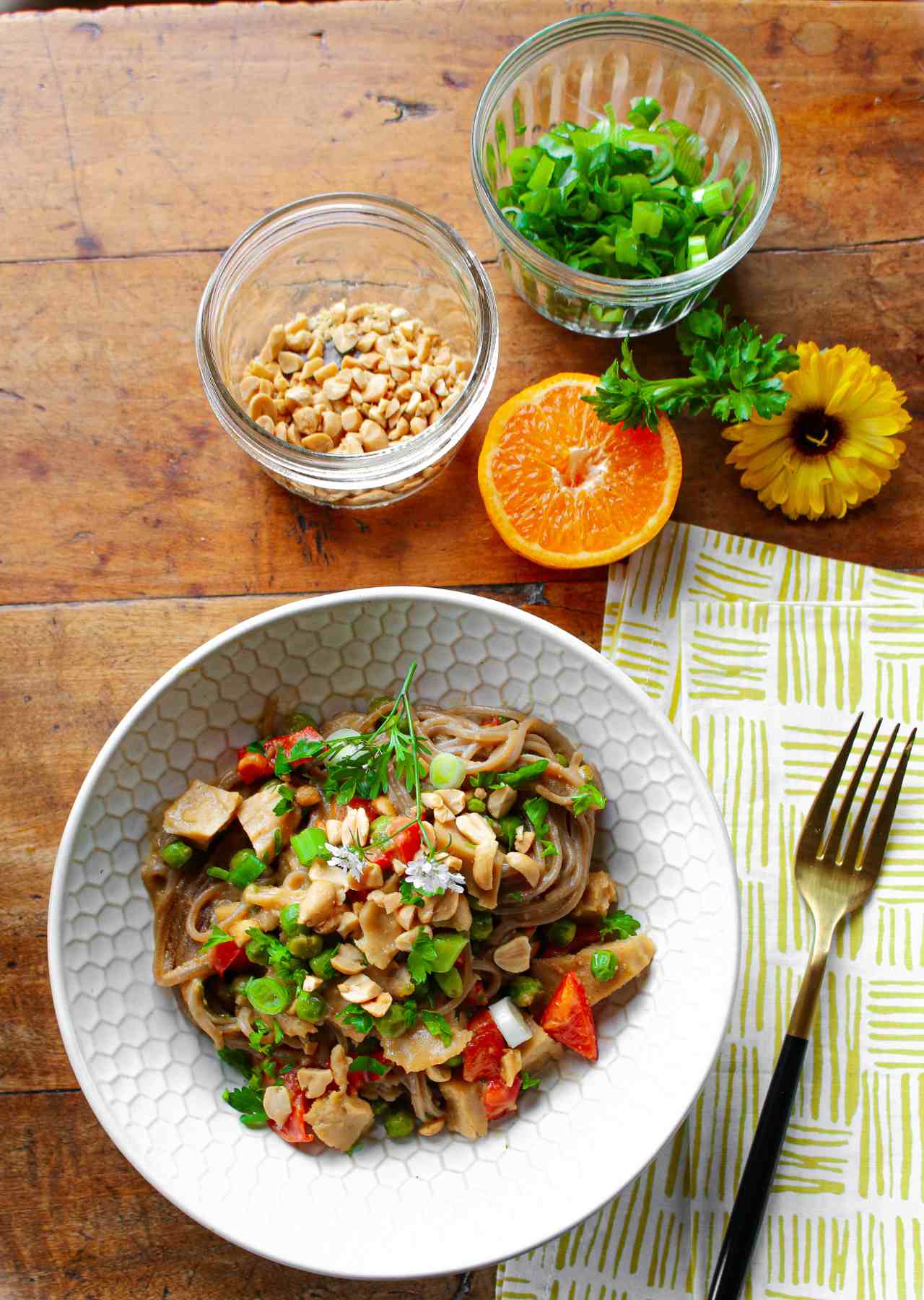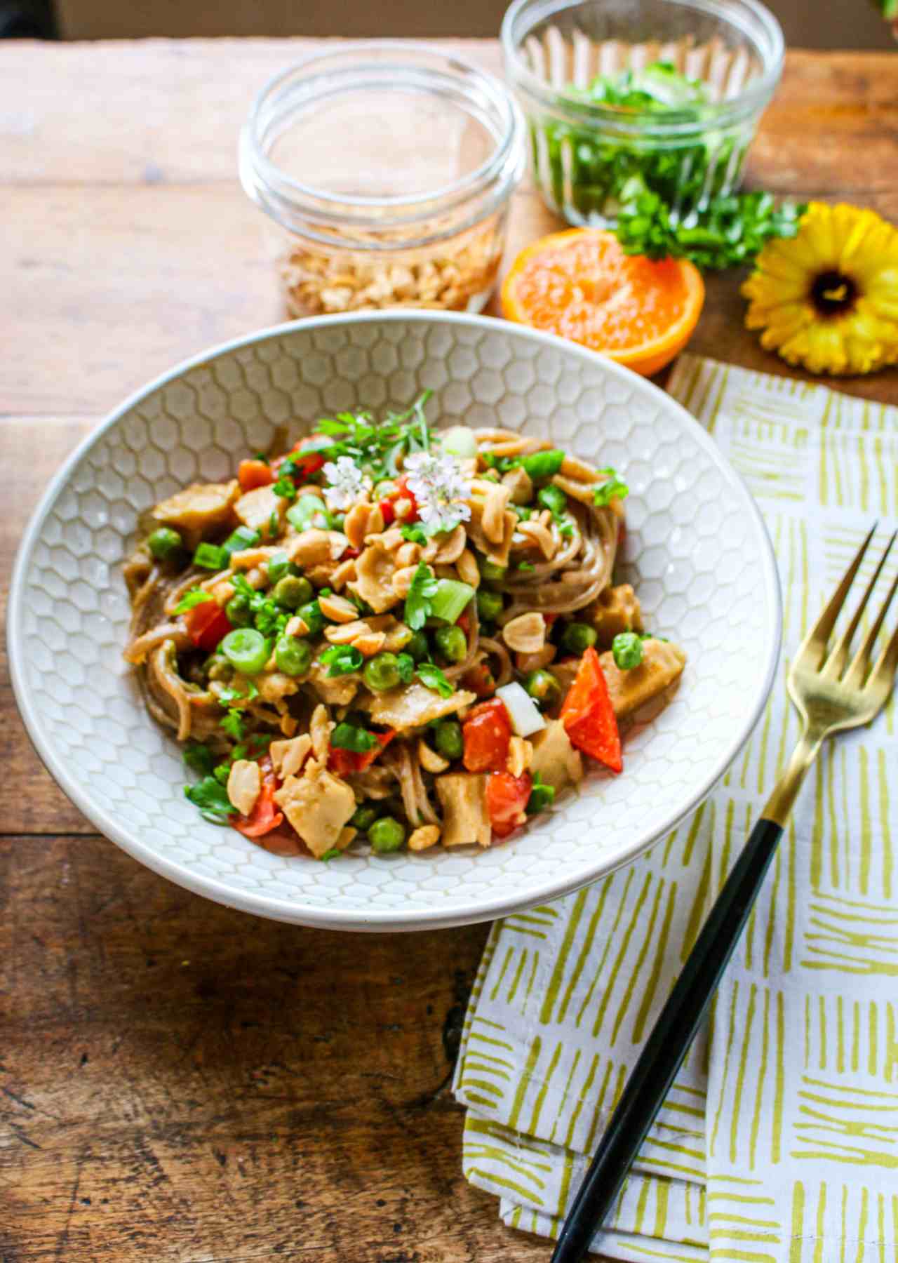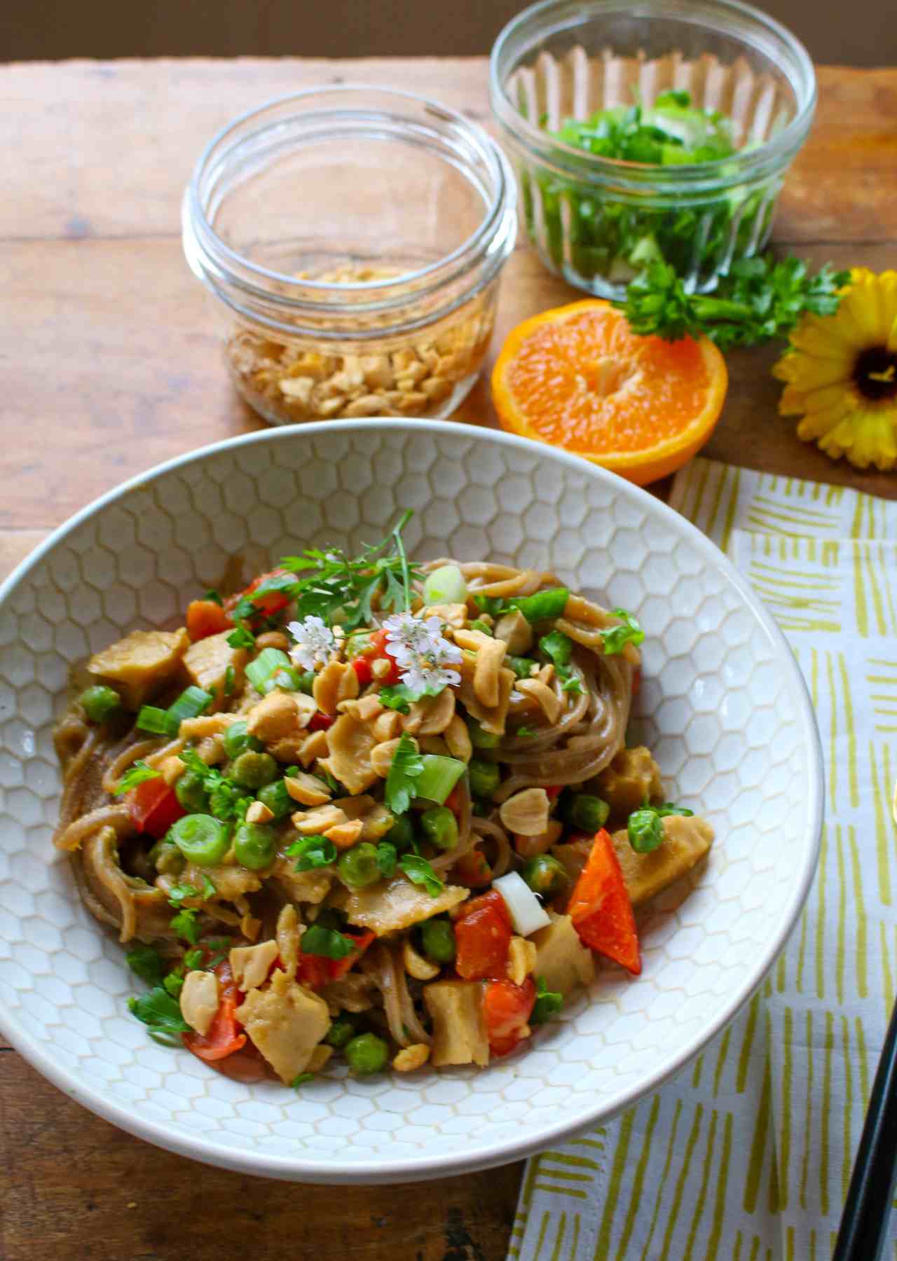 This super simple, vegan 20-minute meal-in-one recipe for Easy Soba Noodles with Peanuts and Seitan is packed with the flavors and health of buckwheat soba noodles, veggies, peanuts, and protein-rich seitan.