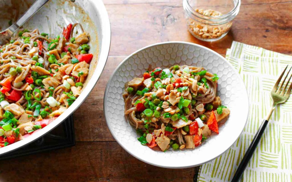 You’ll find oodles of protein, because seitan is a plant protein source made from wheat, and it’s available in seasoned packs (look for it where they stock tofu in markets), such as seitan chicken flavored. Seitan has been part of traditional Asian diets for centuries. Learn how to make your own seitan here. This dish also gets a healthy dose of protein and healthy fats from peanuts. You can swap out the peas for another veggie, such as green beans or asparagus, too. Look for soba noodles—Japanese noodles traditionally made from buckwheat—at most markets, and certainly specially stores. You can cook this healthy dinner recipe up and serve it all in one dish too—less cleanup required.