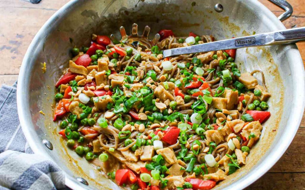 This super Easy Soba Noodles with Peanuts and Seitan is THE delicious, healthy plant-based solution for a busy weeknight dinner that you never knew about. You really can whip this soba noodles main dish up in a single skillet in about 20 minutes, with ingredients you can find in most supermarkets. This vegan soba noodles recipe is rich in plant protein, healthy carbs, and healthy fats. Best of all, this flavorful entrée, which is based on buckwheat soba noodles, is a meal in one, providing a protein source, carb source, and veggie source—all in one dish.