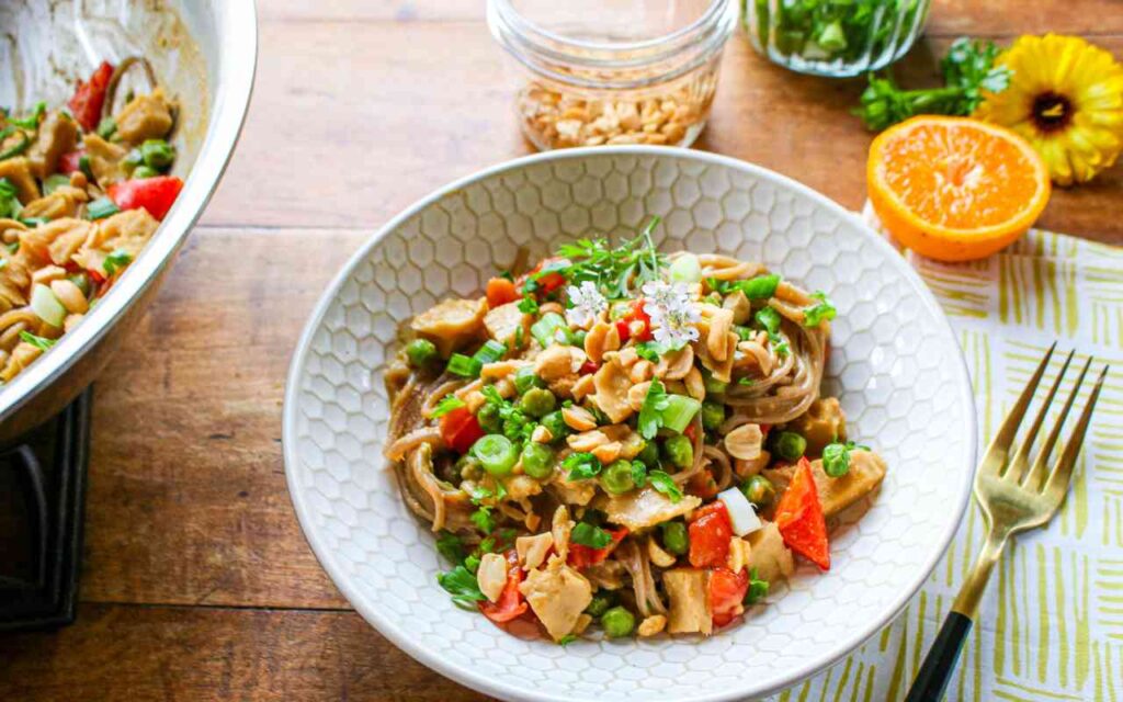 After you learn how to make this dish, you won’t need to rely on highly processed noodle mixes, because you can whip up this economical, family-sized, healthy noodle dish in minutes. I love to pair this vegan dinner with a crisp salad or slaw (though you don’t have to). Pack away the leftovers for lunch the next day–they’ll be delicious served hot or cold. My kids have always adored this recipe, and now my young adult son makes it as his standby recipe when he wants to cook something up fast and easy. He will refrigerate the leftovers and enjoy them later on. Colorful, bright, and tasty—this Easy Soba Noodles with Peanuts and Seitan is a great one to add to your plant-based repertoire.