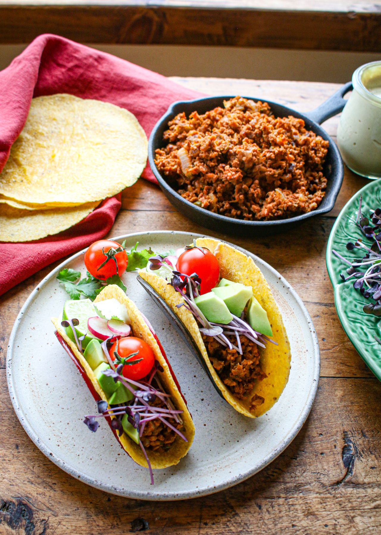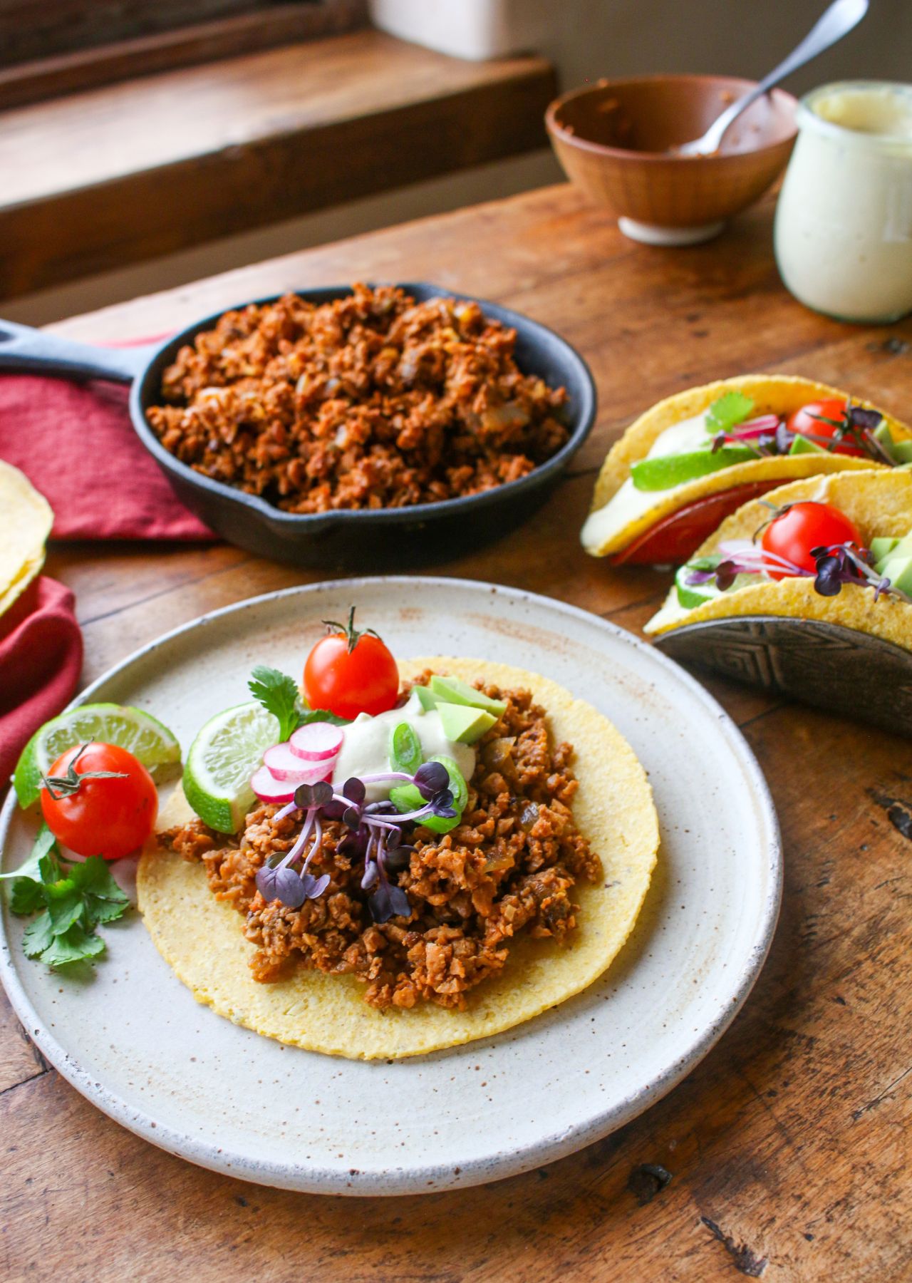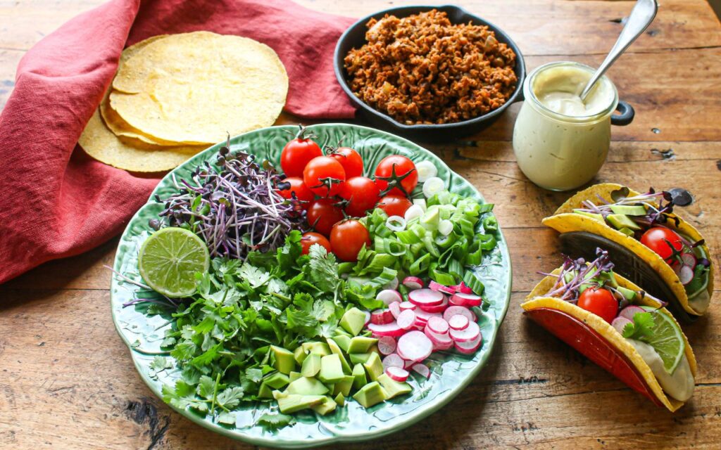 - To make the TVP tacos: Assemble the TVP filling, cashew cream, tortillas, and toppings to prepare your tacos. Fill each tortilla with: