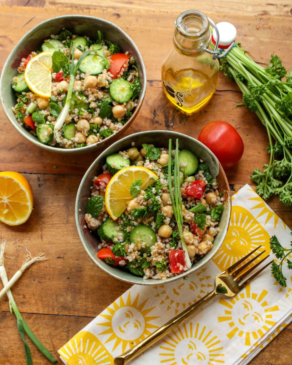 There’s nothing better than a fresh satiating salad for lunch. It’s so easy too. Start with baby or chopped leafy greens (kale, romaine, butter lettuce, arugula, spinach); top with even more veggies you have on hand such as bell peppers, canned artichoke hearts, sun-dried tomatoes, and radishes; layer in a plant protein, such as baked tofu, beans, or tempeh bacon; sprinkle over some nuts, seeds, and/or dried fruit, such as pistachios, almonds, sunflower seeds, or raisins; and drizzle with EVOO and a squirt of lemon juice. Presto! Lunch is served!