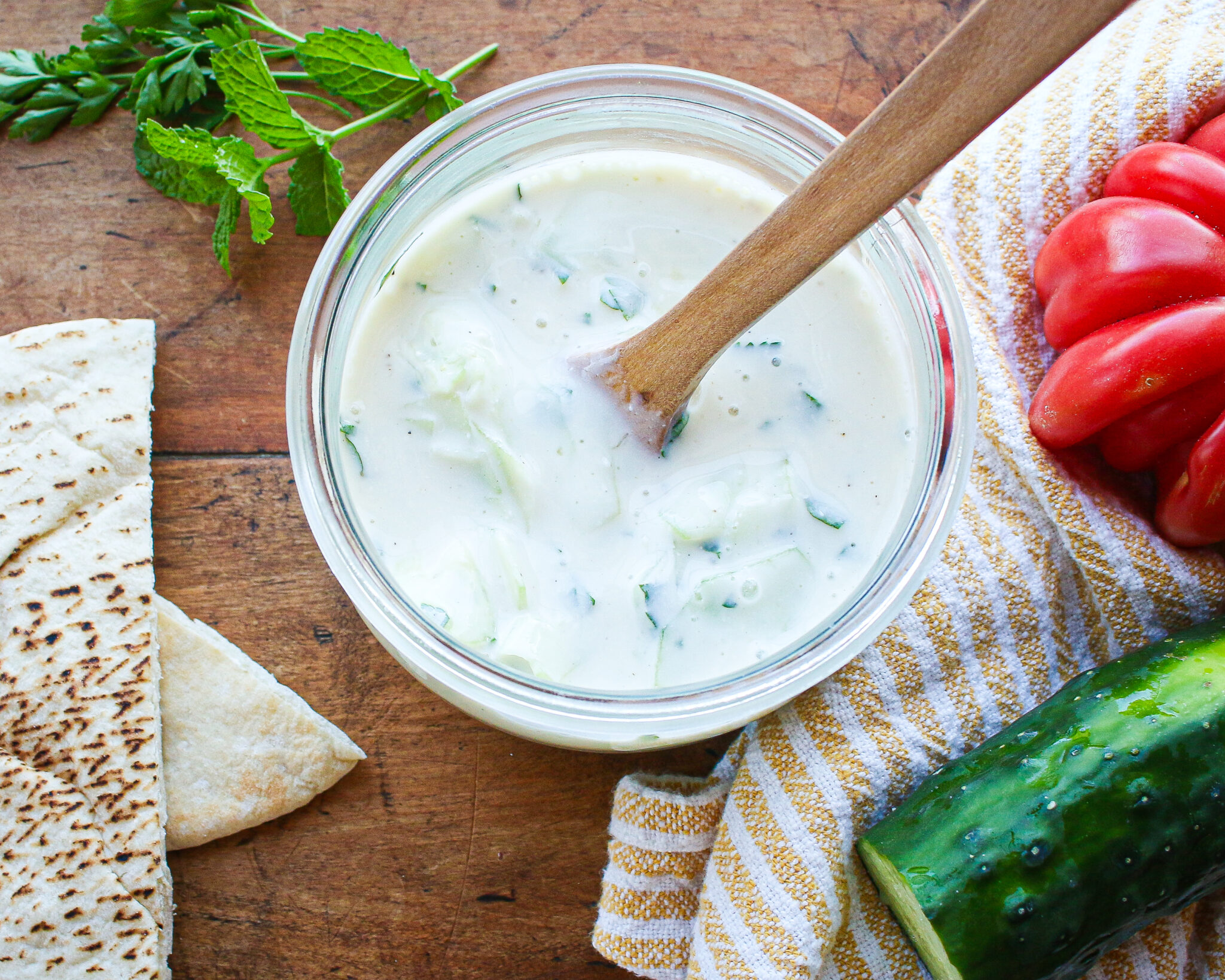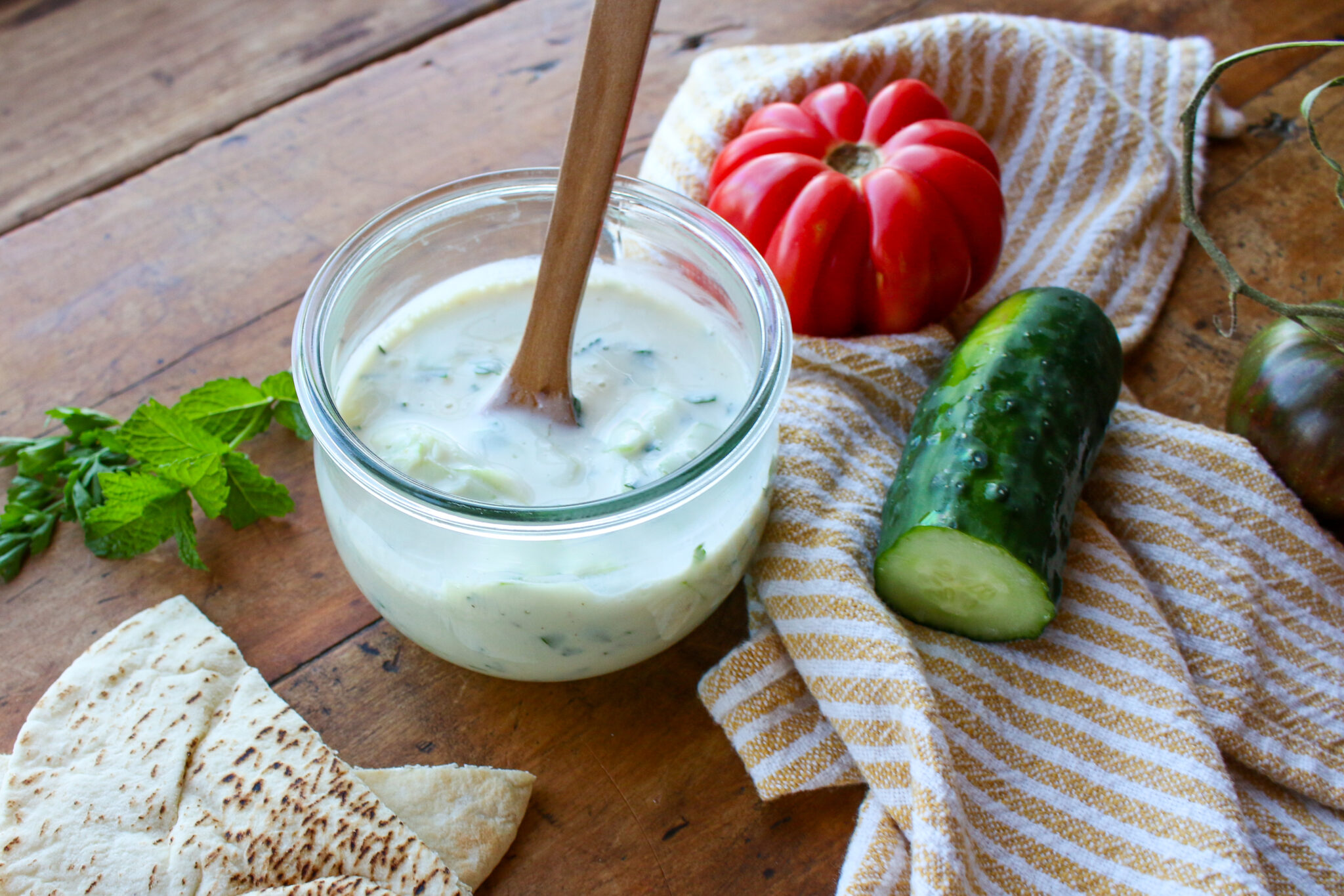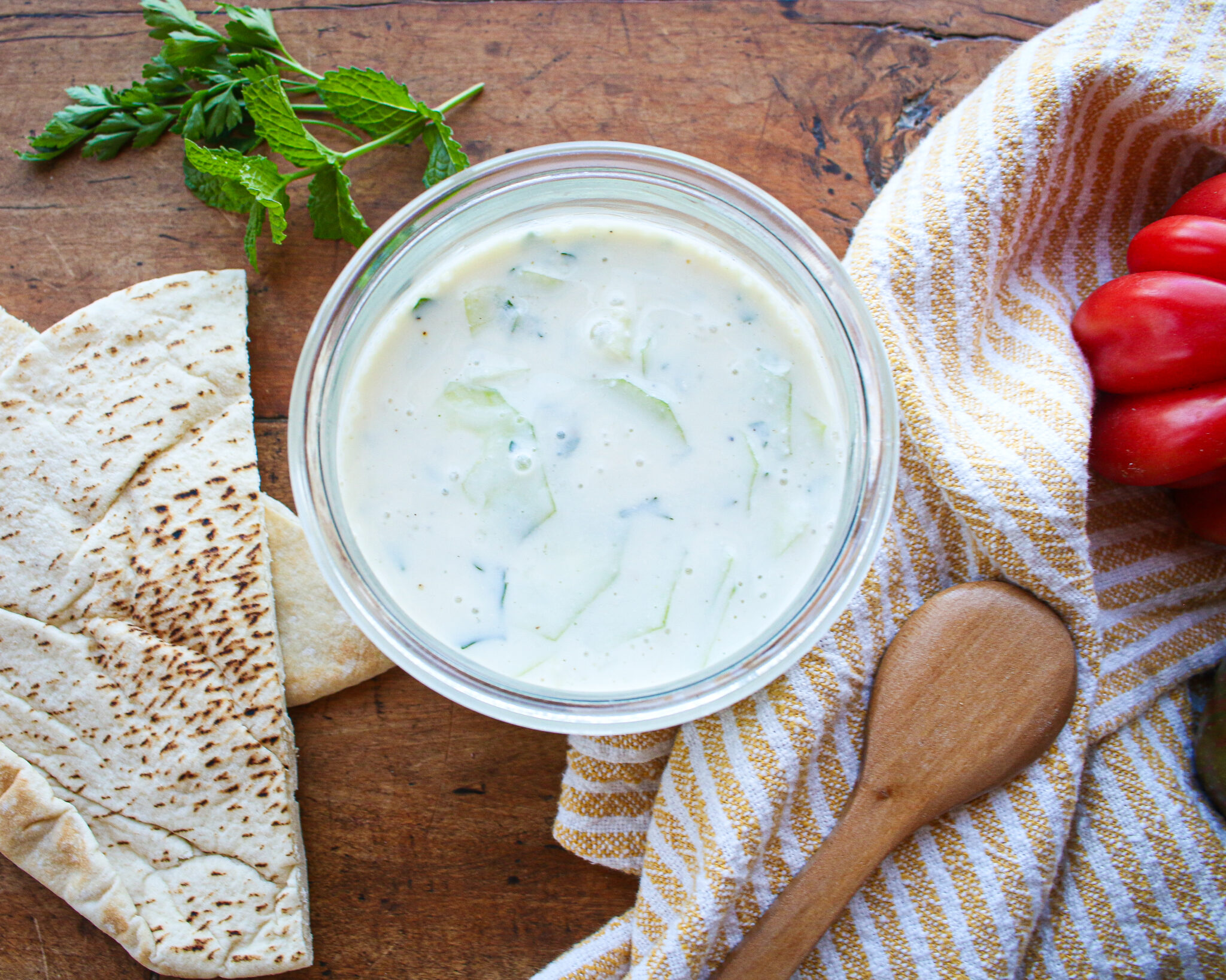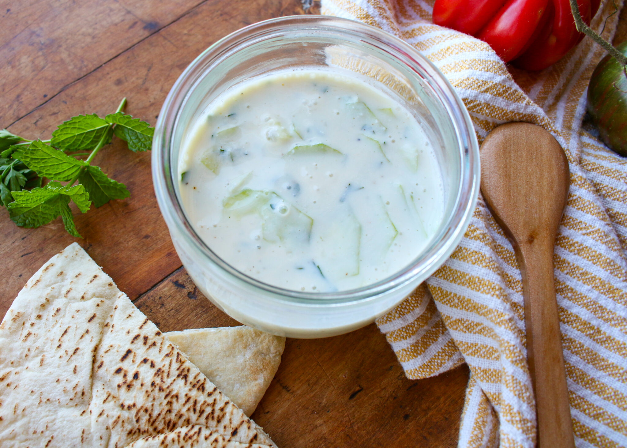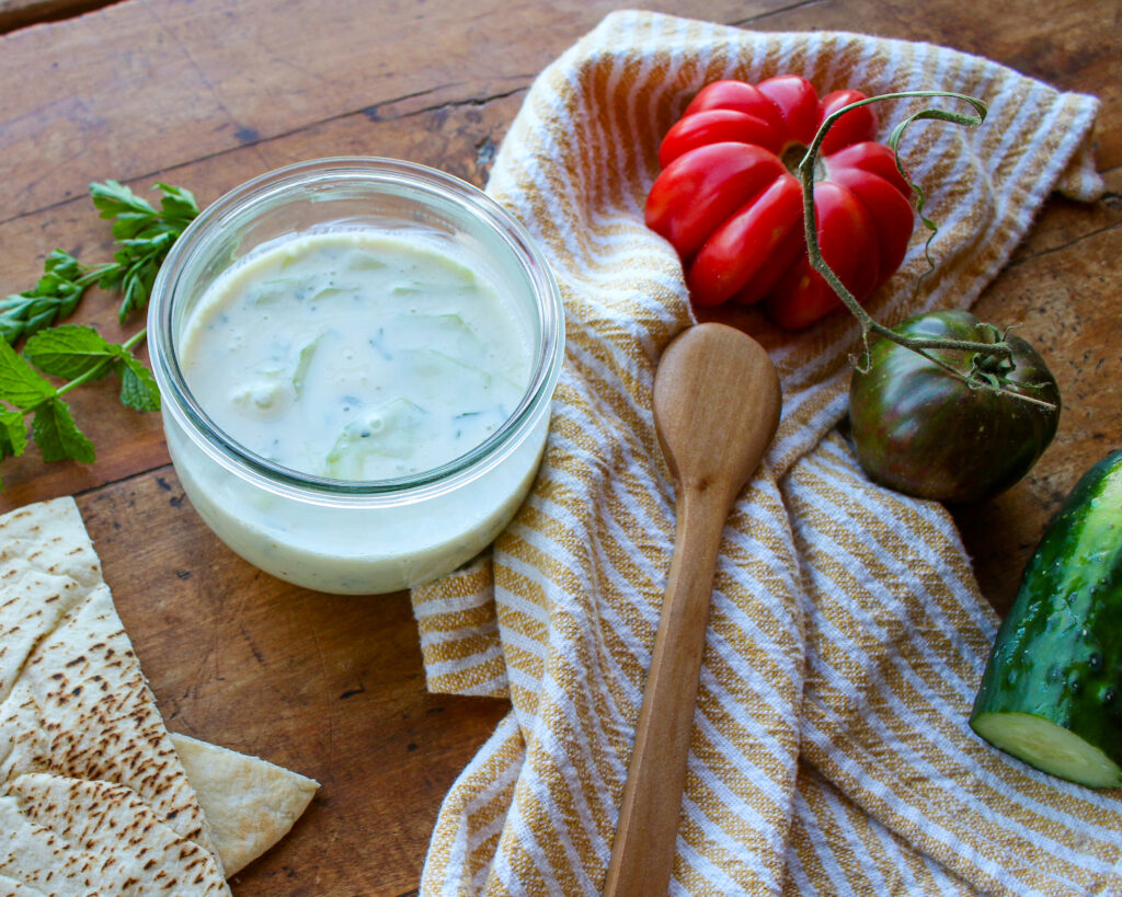 Mix up a batch of this homemade gluten free vegan tzatziki, which features plant-based yogurt, cucumbers, garlic, herbs, and lemon, to keep on hand for your favorite dinner meals, meal prep recipes, potlucks, and parties. If it’s on hand, you’ll find a million reasons to use it, whether it’s with a green salad, crackers, soup, curry dish, sandwich, or chili. I love to store tzatziki in a Wek jar or mason jar so that it goes easily from fridge to table. Enjoy!