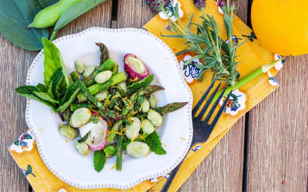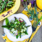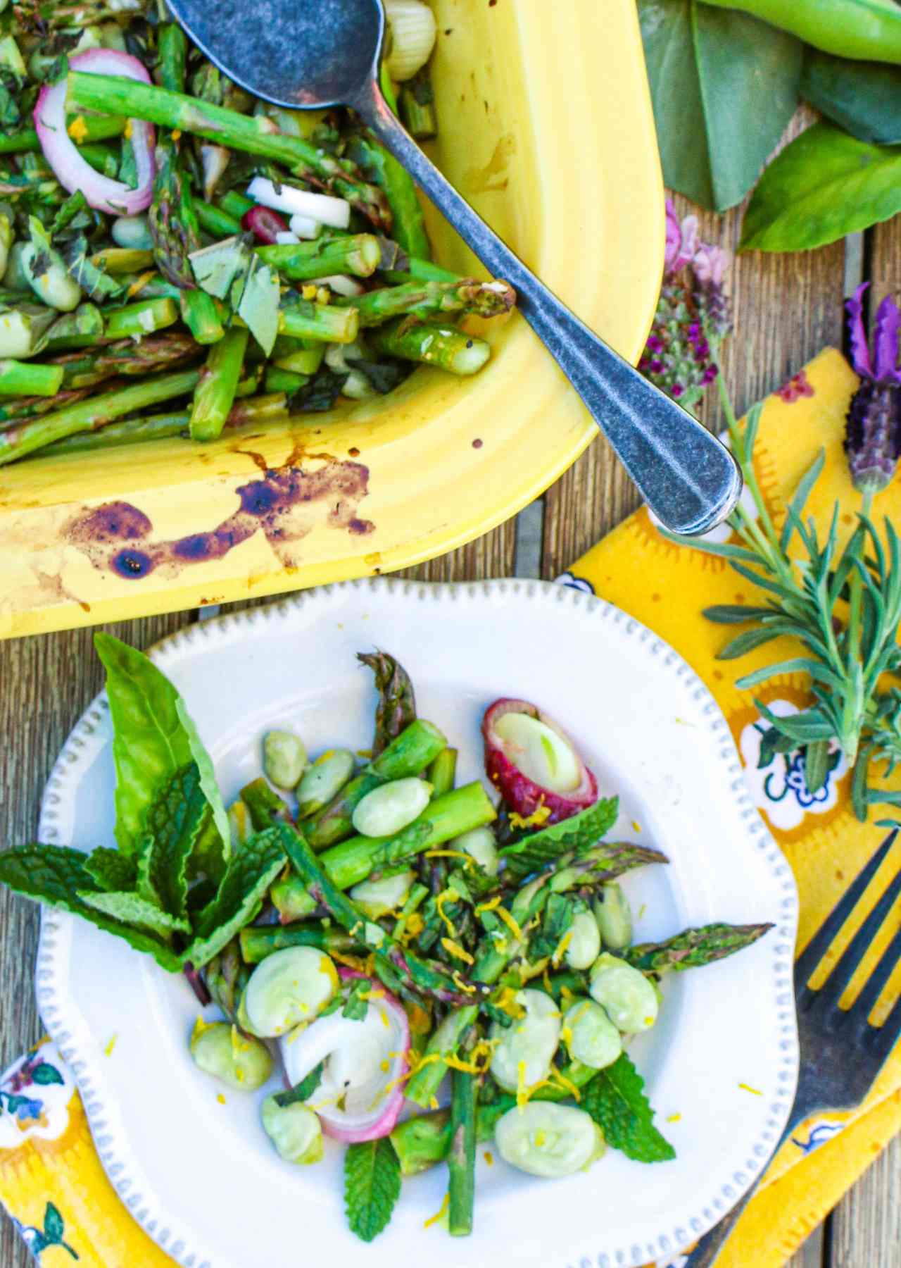 Nothing spells spring comfort to me quite like the first appearance of both asparagus and fava beans in farmers markets. These cool, verdant veggies emerge from the warm, damp earth and on plush vines during the first warm days of spring and early summer. In fact, I have both of these lovely veggies gracing my vegetable garden. This easy spring Sautéed Asparagus with Fava Beans—which is completely plant-based and gluten-free—uses these vegetables to their very best ability, in a simple, straightforward dish which can be enjoyed as an entrée or side-dish, or served over grains or pasta. Nothing too fussy or complicated—just let the natural ingredients of fava beans and asparagus shine through. Just sauté fava beans and asparagus with a bit of spring onions, garlic, olive oil, basil, mint and lemon, and in a few minutes you have a gorgeous, delectable dish.