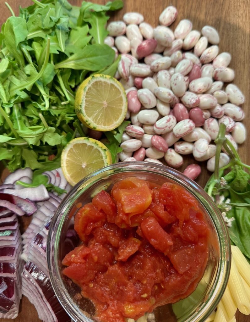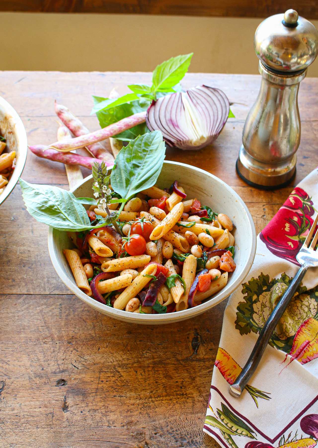 This recipe is 100% plant-based (vegan) and packed with nutrients, thanks to the pasta, greens, and beans. Many Italian pasta dishes call upon this simple trio of ingredients to make up rustic, nutritious, delicious dishes that are naturally plant-based. With the addition of tomatoes, onions, garlic, lemon and basil, the dish really sings with flavor, nutrition, and aroma. It is also delicious the next day warmed up for lunch—or even served cold as a pasta salad. Make this recipe gluten-free by using gluten-free pasta.