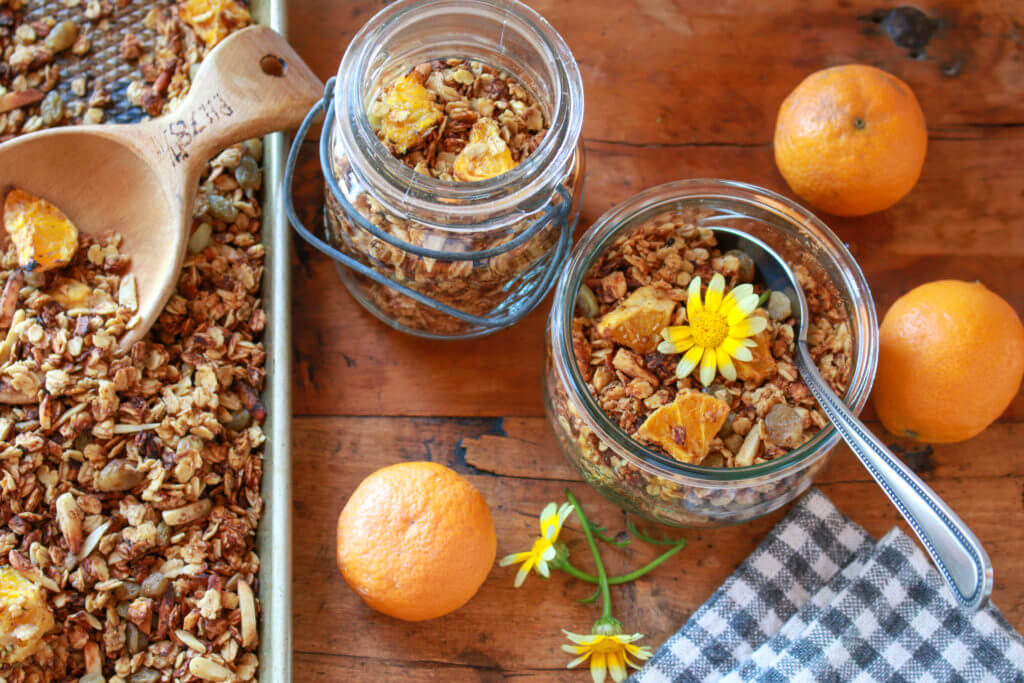 This scrumptious Fresh Orange Spice Low Sugar Granola features a homemade low sugar granola recipe, which is also vegan and gluten-free. Celebrate the sunny flavors of fresh oranges in this granola recipe, which is also filled with nutrition compliments of whole grain oats, almonds, coconuts, raisins, spices, and citrus.