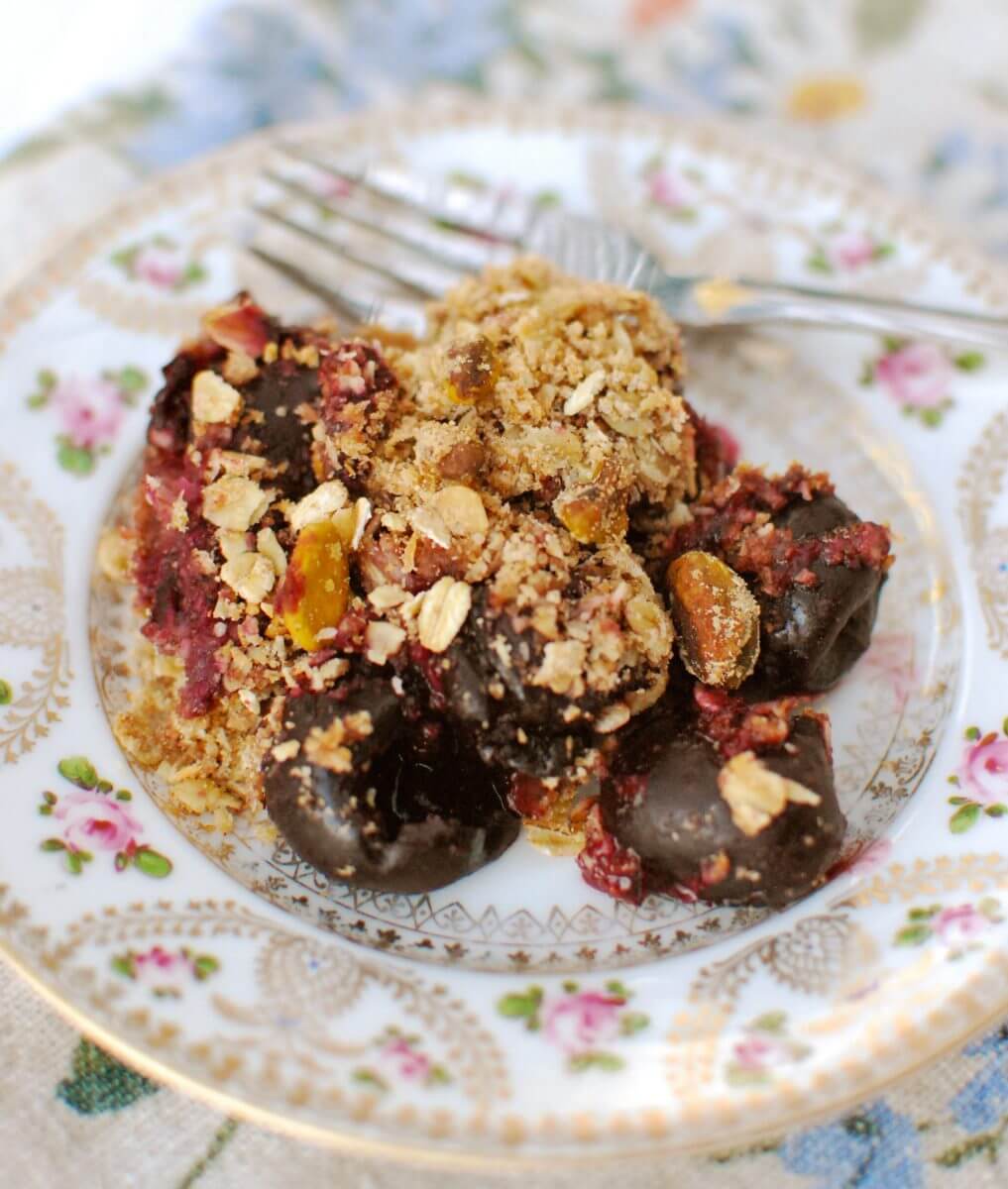 Crisps are a simple way to showcase your favorite fruits, whether fresh, frozen, or preserved. All it takes is fruit topped and baked with a few quality ingredients. Fill a baking dish half to three-quarters full with sliced fruit or whole berries (fresh or frozen). Add a squeeze of lemon juice for balance, a drizzle of 100% fruit juice, and a couple of spices like cinnamon, nutmeg, or vanilla. While this combination may be sweet enough for most palates, you can add a spoonful of sweetener, such as brown sugar or agave syrup if desired. Mix a 3:1:1 ratio of oats, whole grain flour, and brown sugar with cinnamon, nutmeg, or ginger, a dash of salt, and about a quarter cup melted margarine. Add chopped nuts—walnuts, almonds, or pecans—if you’d like. Add just enough water so mixture just comes together. Crumble over the fruit and bake until golden and tender. For an uber easy recipe, try this Pistachio Cherry Coconut Crisp.