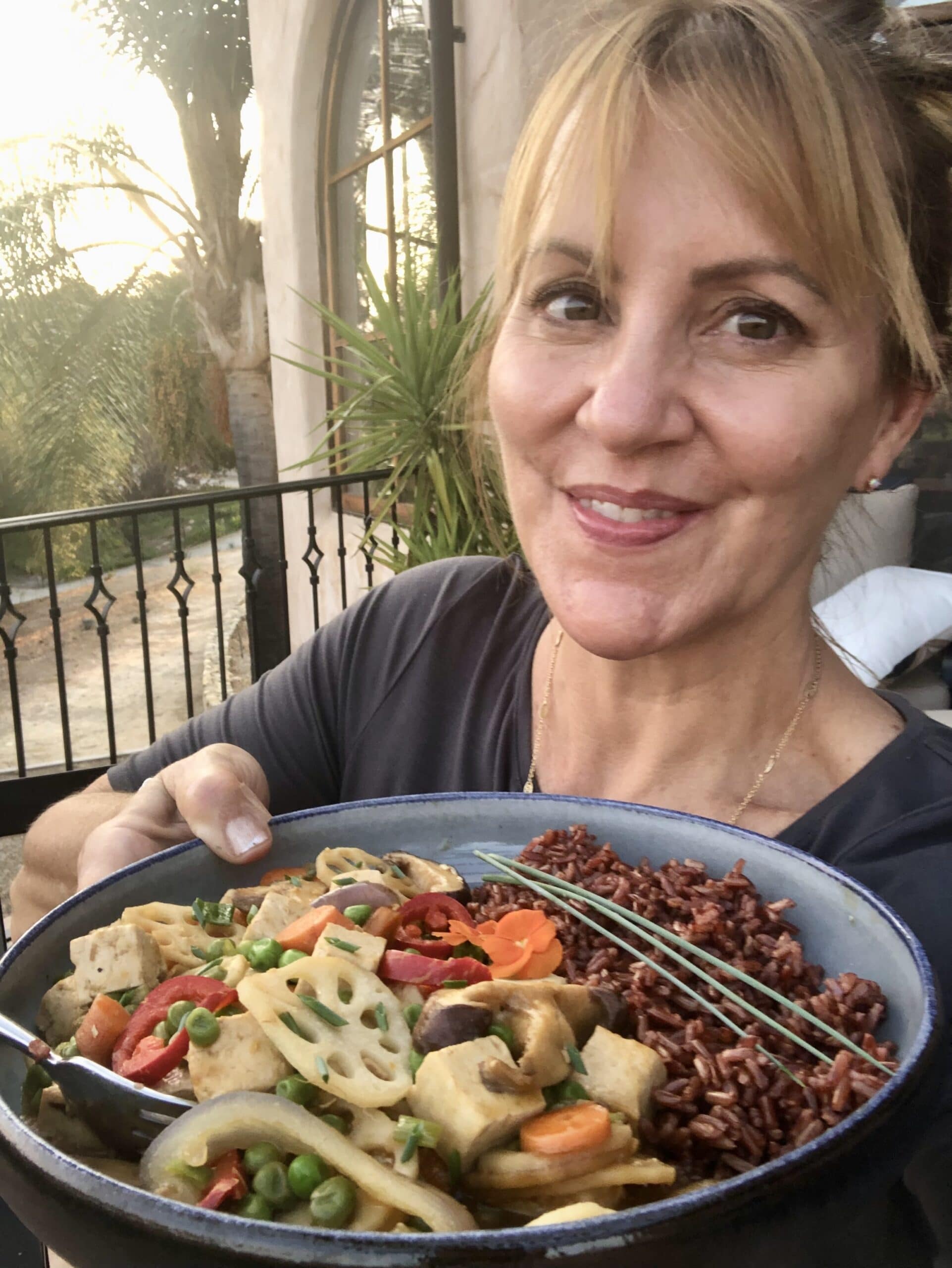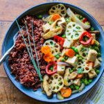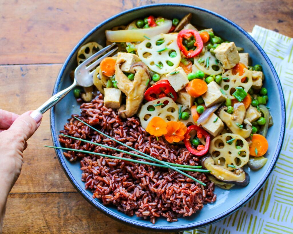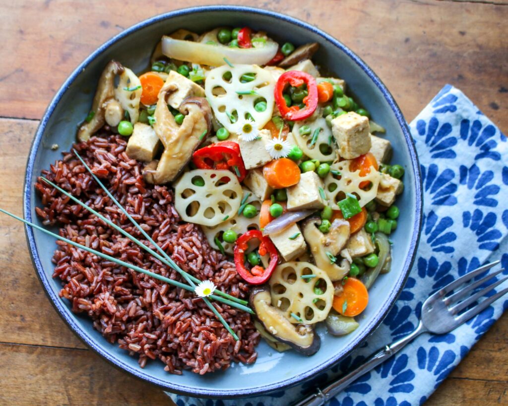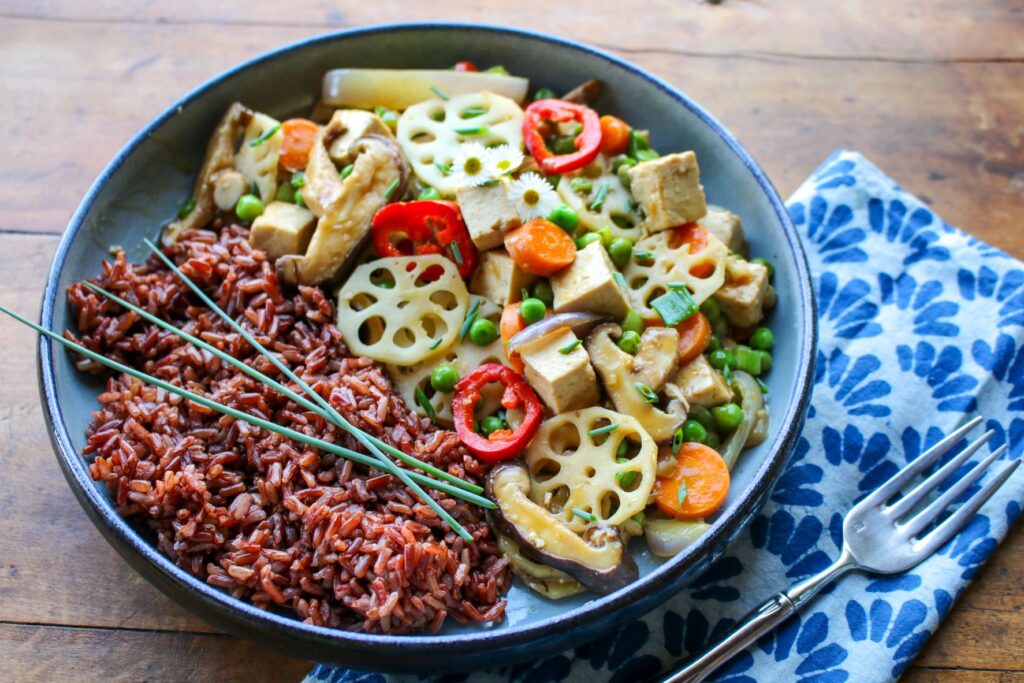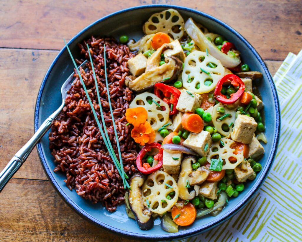 This gorgeous, completely plant-based (vegan), gluten-free Ginger Lotus Root Stir-Fry with Red Rice is an easy meal you can get on the table quickly, though it certainly looks impressive! Based on simple Chinese food traditions, the ingredients of this quick stir-fry include carrots, ginger, garlic, tofu, mushrooms, peas, red rice and the star of the show: lotus root, which is easily found in most Asian markets. Crispy, crunchy, and rich in flavors, compliments of the veggies, ginger, garlic and soy sauce broth, this meal is off the charts in taste appeal. Packed with protein, vitamins, minerals, phytochemicals, and fiber, this plant-based meal will also set you up for healthy eating, and the leftovers are great too. You can get this one-dish meal on the table in 45 minutes, even less if you cook your rice ahead of time.