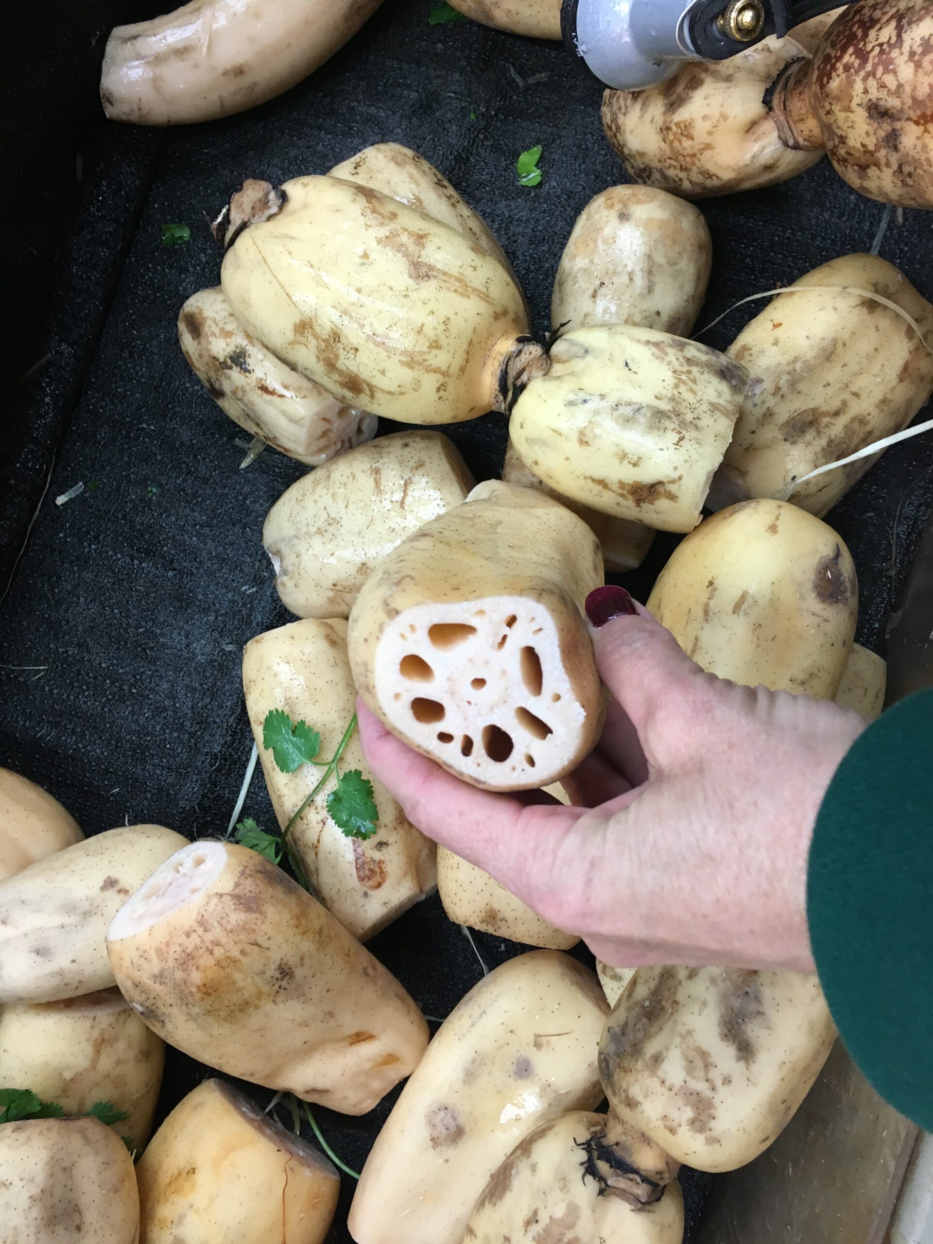 If you’ve ever seen those lacy, slices of crisp, creamy-colored veggies in a dish at a restaurant and wondered what they are, now you know! Lotus root is the edible rhizome of the lotus plant—basically the subterranean stem of this aquatic plant responsible for those beautiful pink-hued or white flowers you might have seen. Native to Asia, as well as other parts of the world, these plants grow in the mud, ponds, and lagoons. Almost every part of the lotus plant is edible! The roots themselves are cylindrical and brown, but once you peel them and slice them the lacy texture is revealed! Then simply boil them in water to use in cooking. You can also find lotus root boiled in bags in the fresh produce section of Asian markets (see below). Just open the bag, drain the liquid and cook with them!