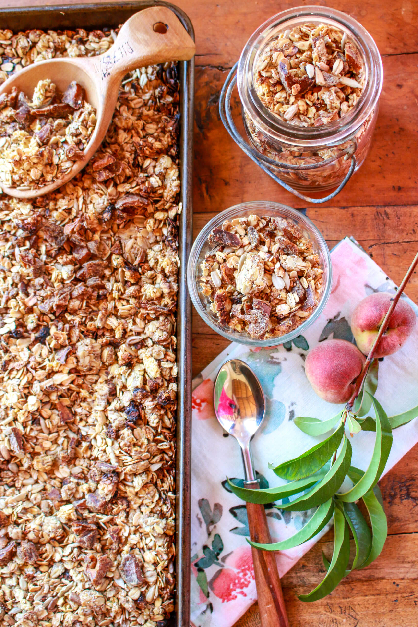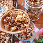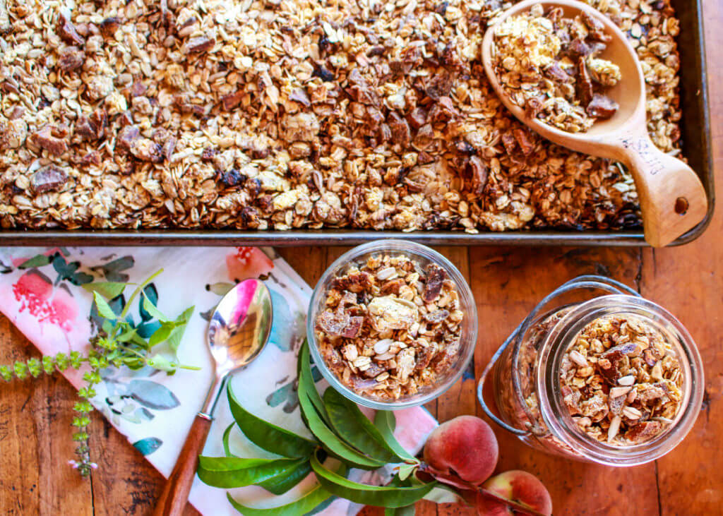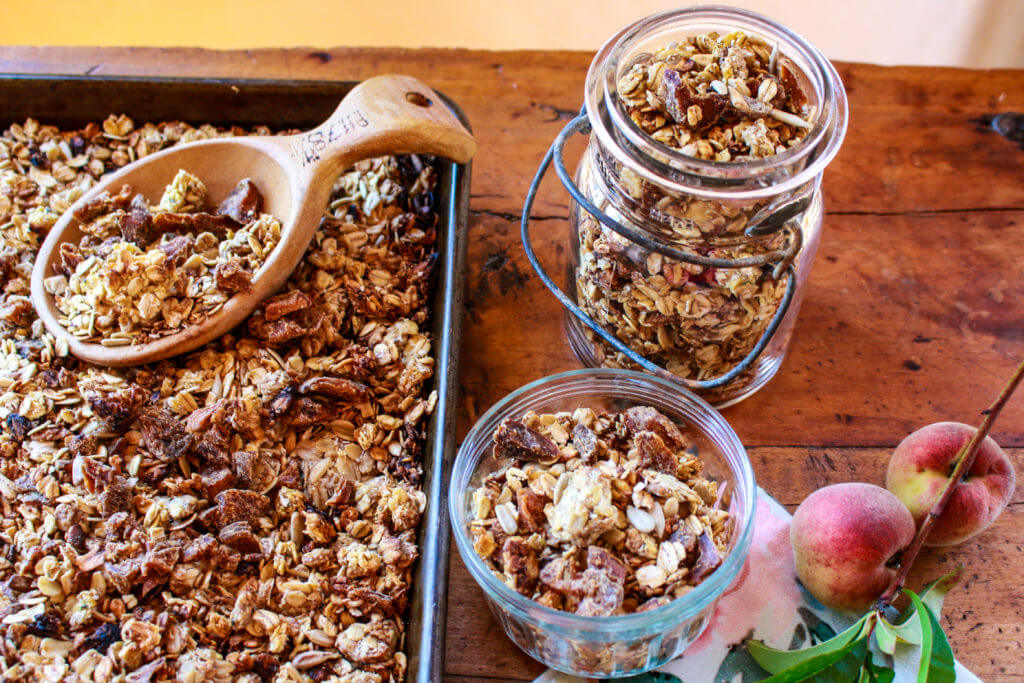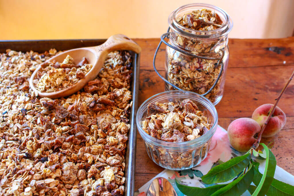 This super easy, sunny recipe for Ginger Peach Sunflower Granola will brighten up any morning. Filled with sunflower seeds, sunflower butter, ground ginger, dried peaches, and oats, this recipe is light in added sugars, contains no oils, and is packed with nutrition power, including heart-healthy natural fats and whole grains.