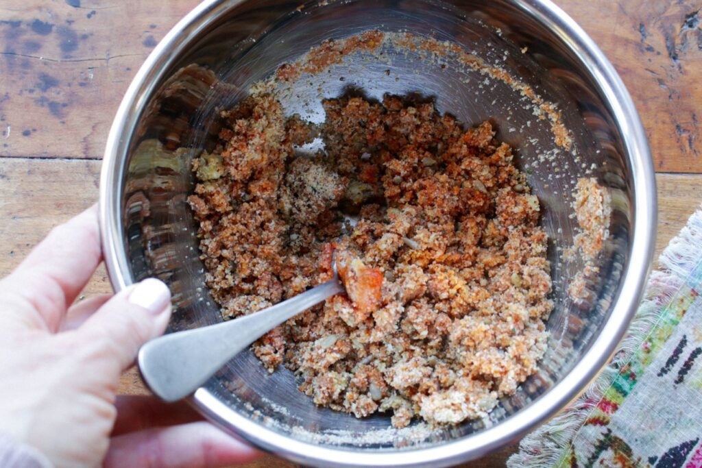 - Add almond flour, flax seeds, hemp seeds, sunflower seeds, onion powder, garlic powder, oregano, and salt (optional) to a medium mixing bowl. Stir well to combine.