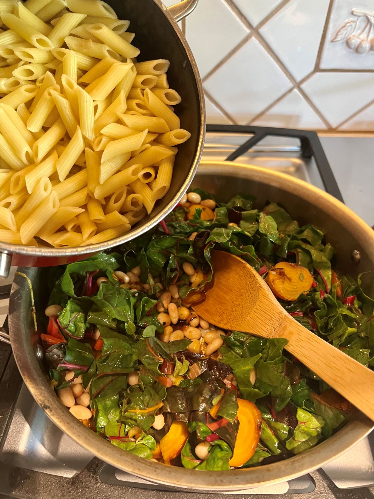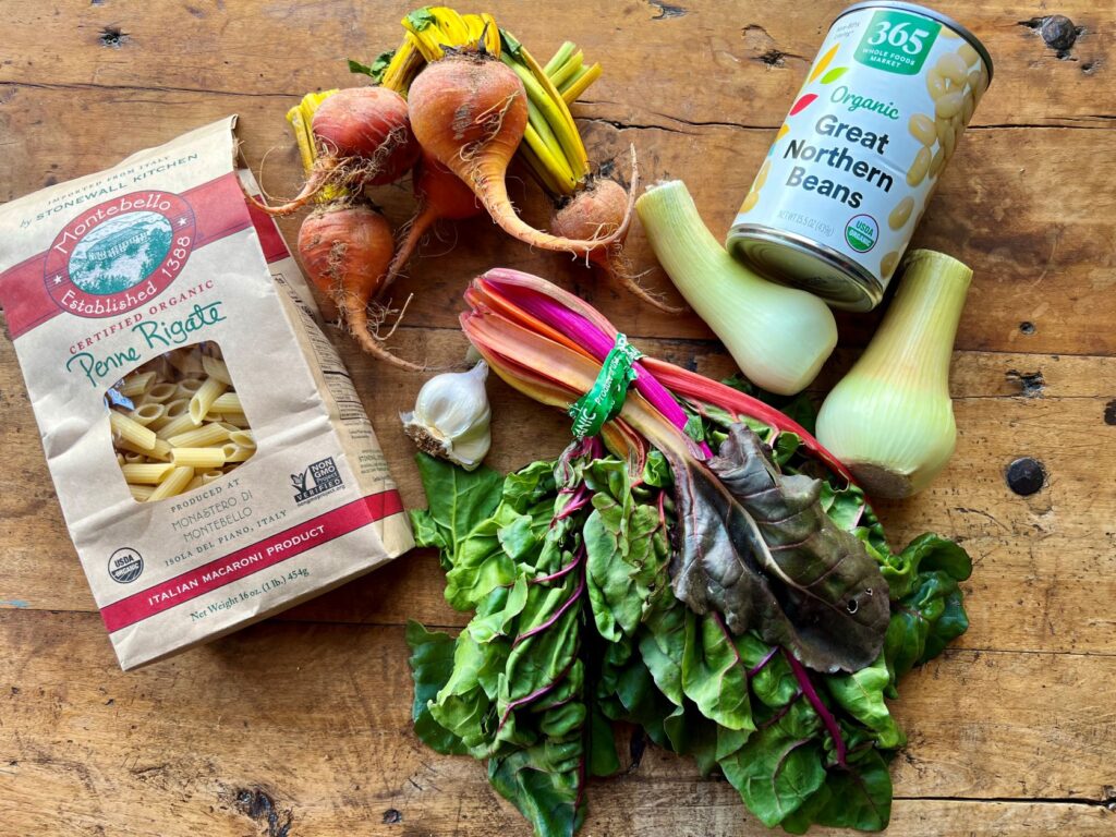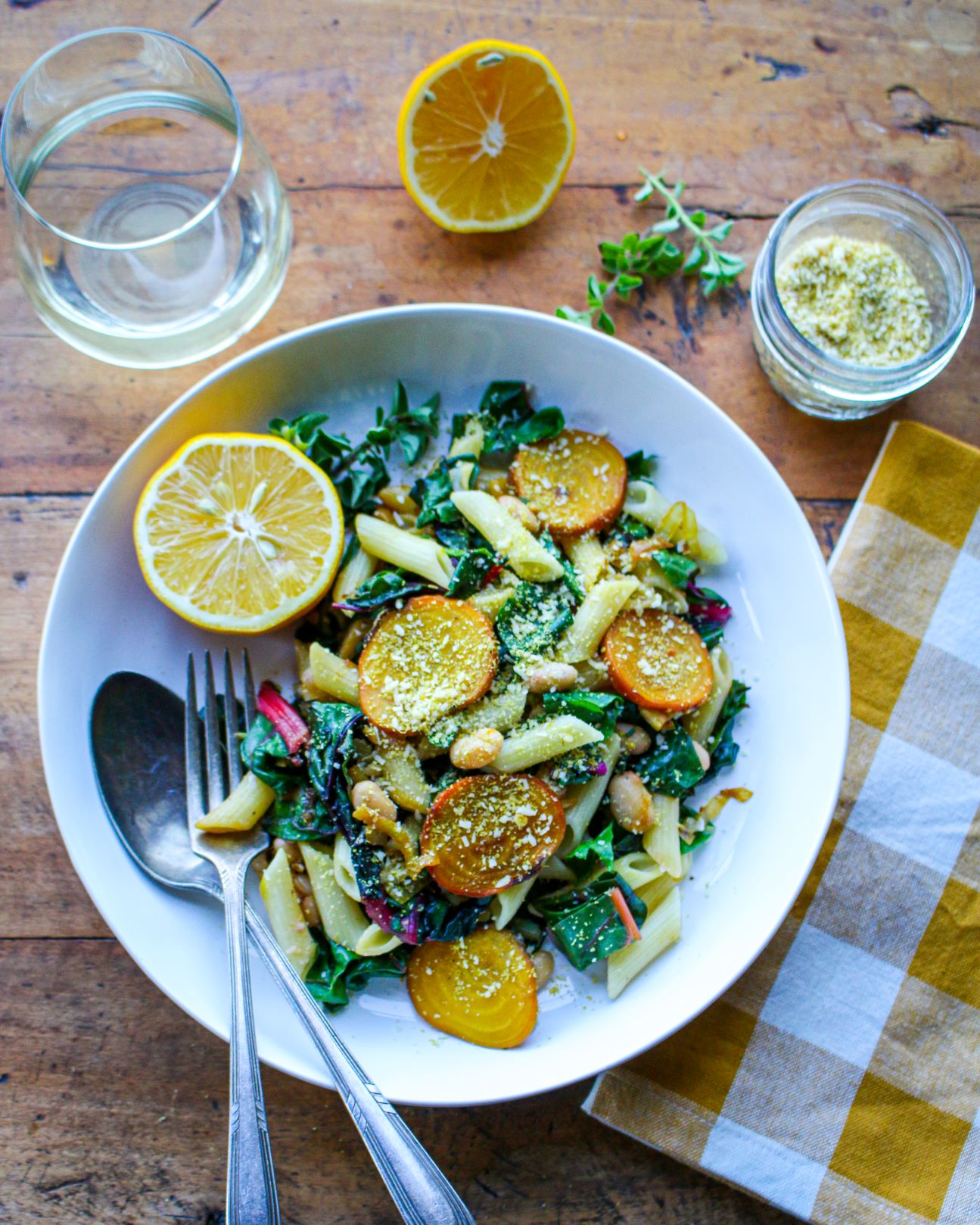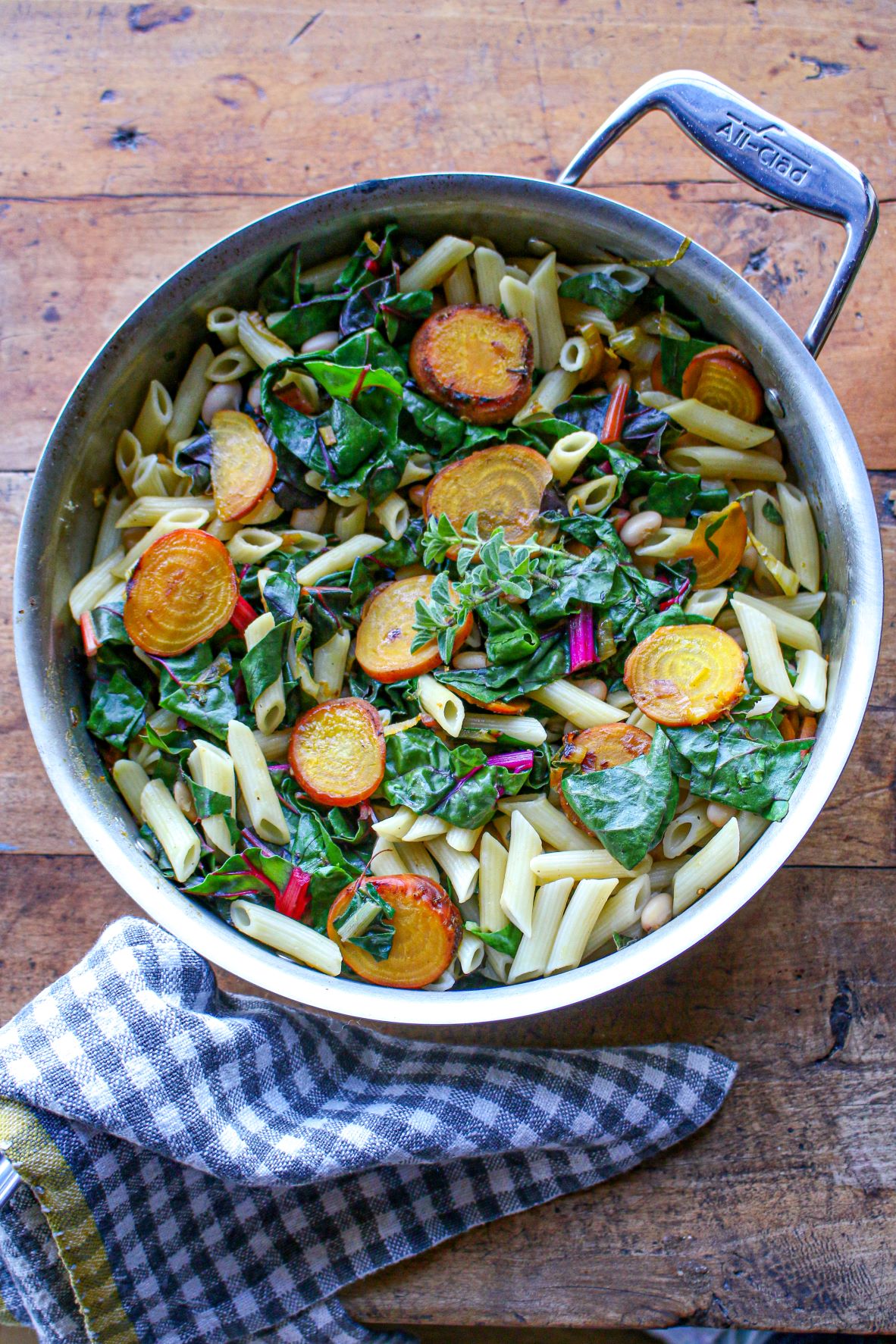 This recipe features penne pasta, golden beets, white beans, onions, Swiss chard, and garlic.Chop the vegetables.Heat olive oil in a saute pan.Saute beets, onions, and garlic. Season with salt and pepper, as desired.Add lemon juice and lemon zest.Add chard.Add oregano.Rinse beans.Add beans.Add cooked pasta.Enjoy!Print
