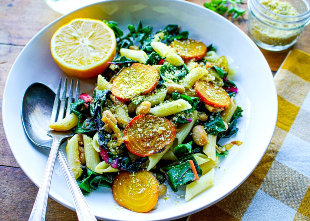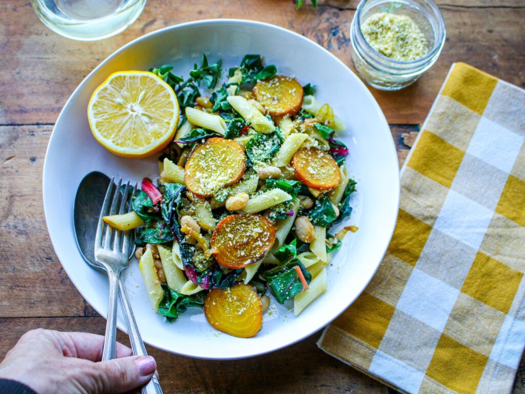 This easy, delicious, colorful, nutrition-packed, plant-based recipe for Golden Beets and Chard with White Beans and Penne can be created in 20 minutes with only 8 ingredients.
