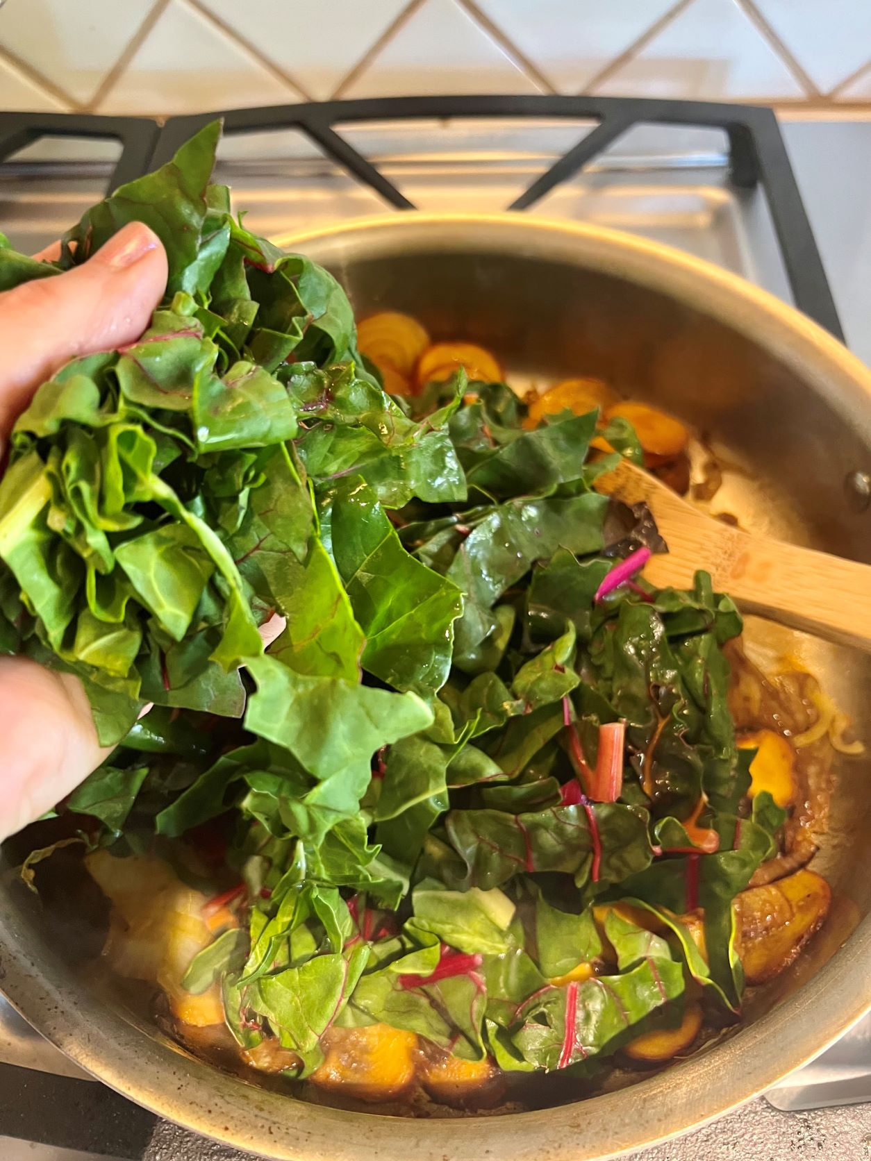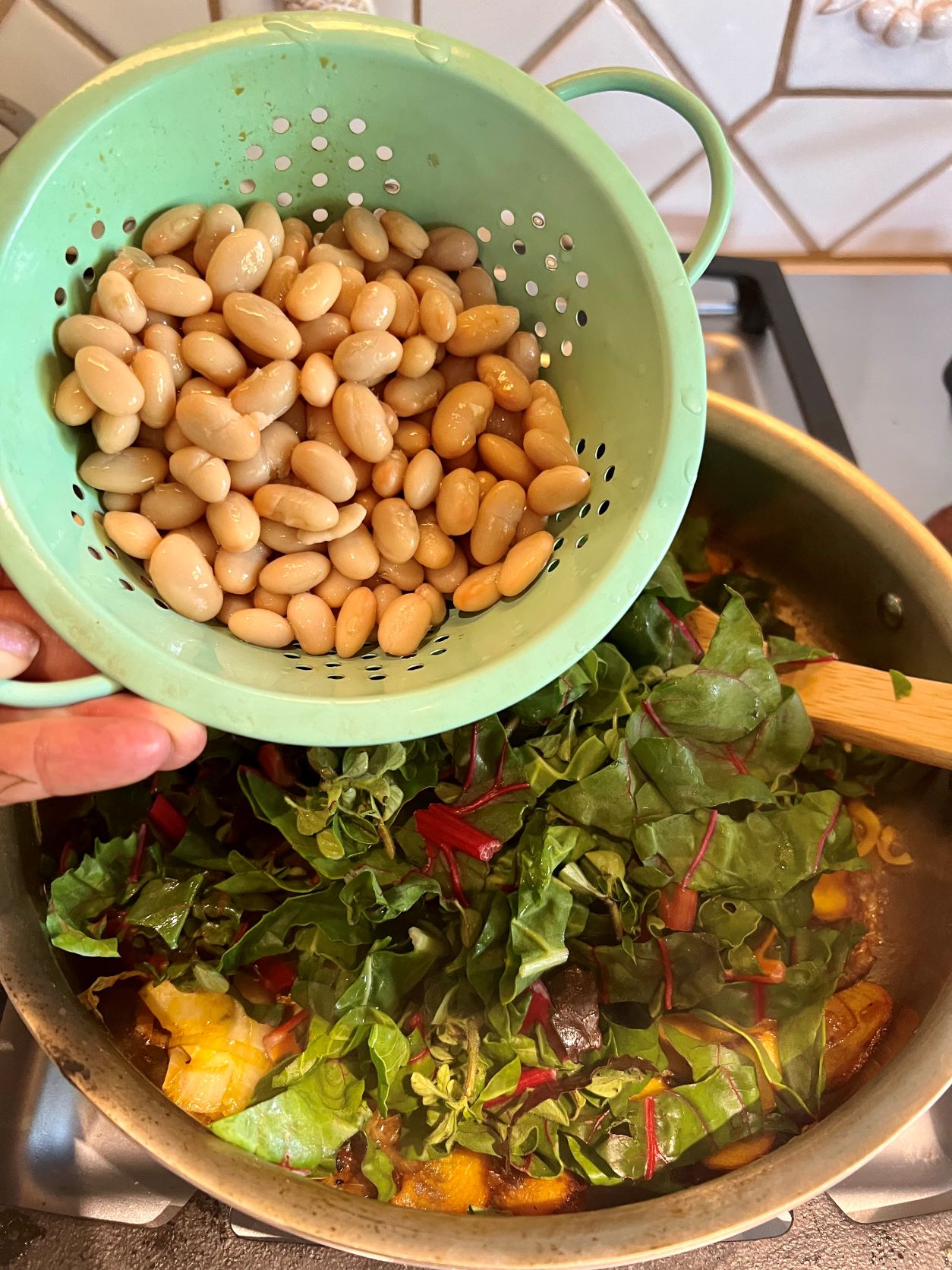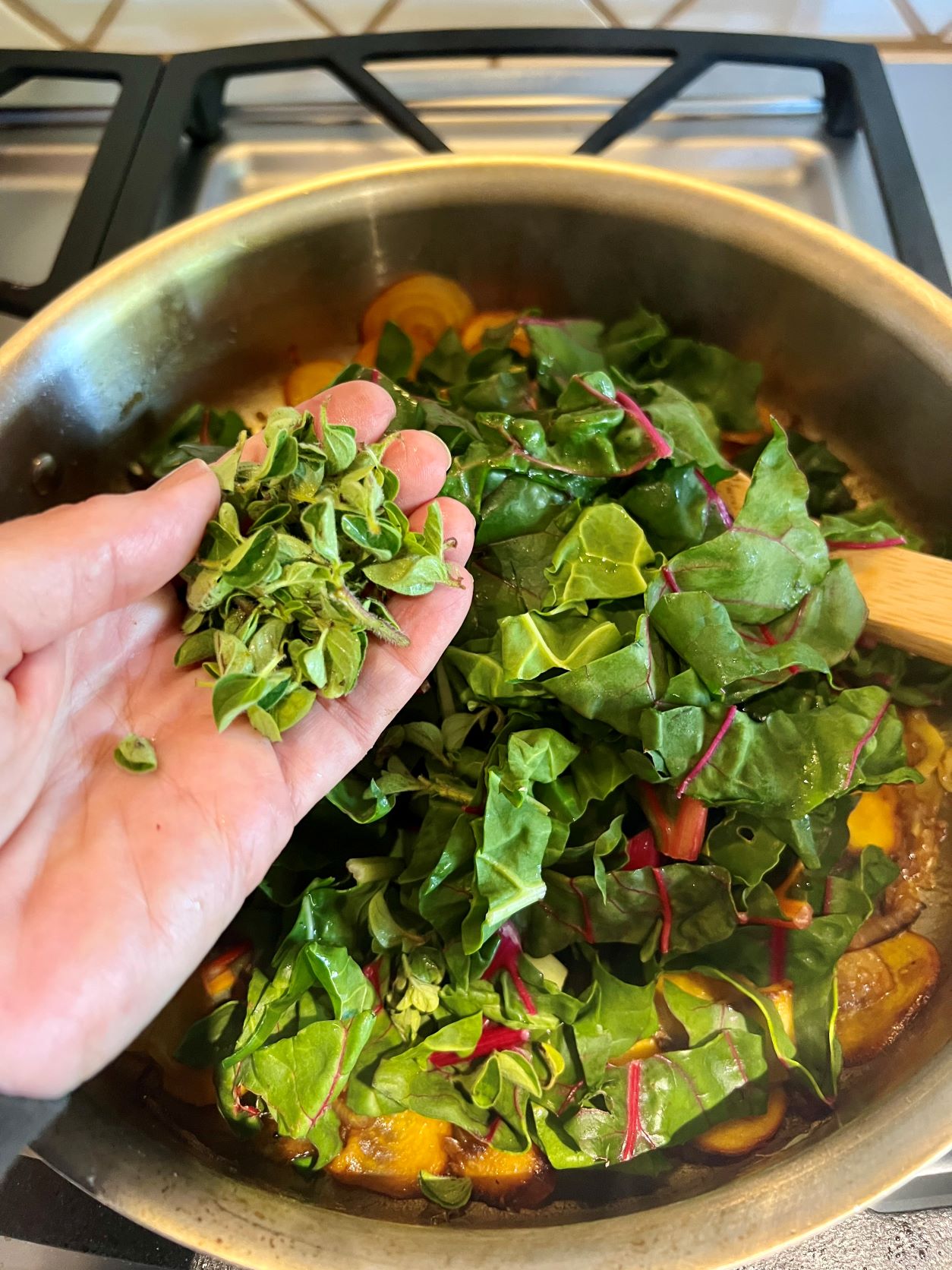 Add Swiss chard, oregano, and beans. Cover and cook for about 3 minutes, until chard is just barely wilted, but bright green.